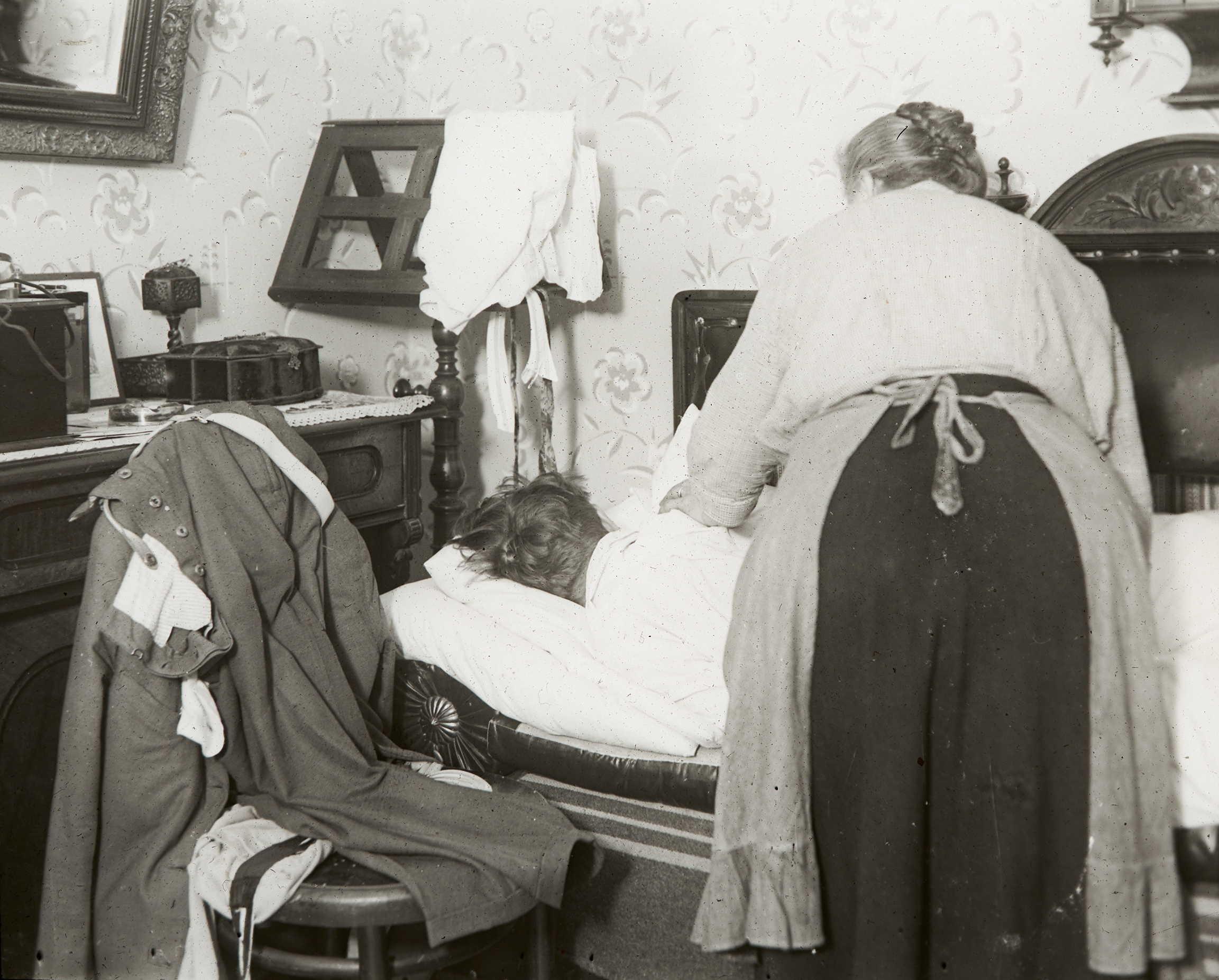 Eine Frau kümmert sich um eine kranke Person, die im Bett liegt.