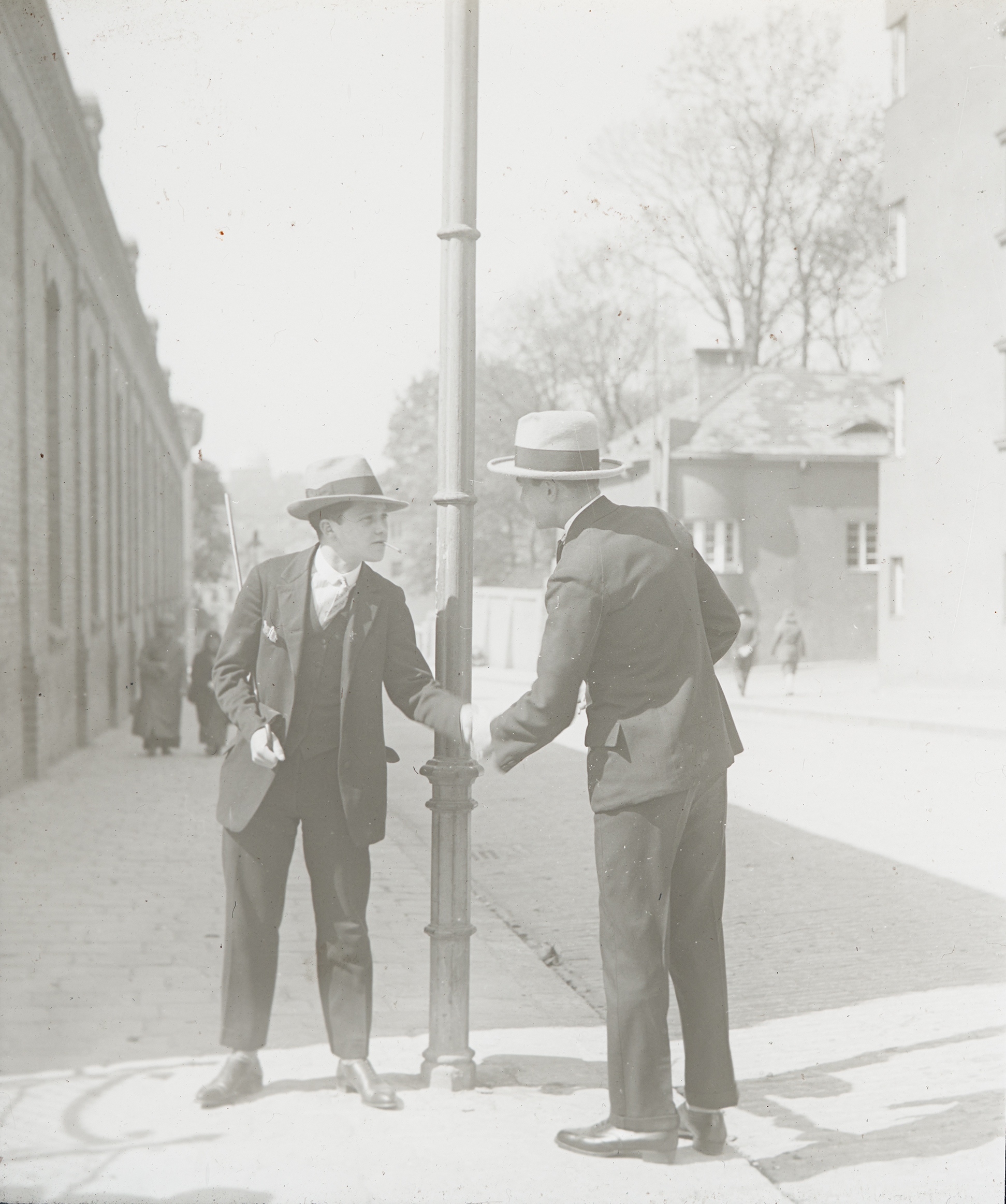 Ein Mann in Anzug mit Hut, der eine Zigarette im Mund hat. Er lehnt an einem Straßenpfeiler.