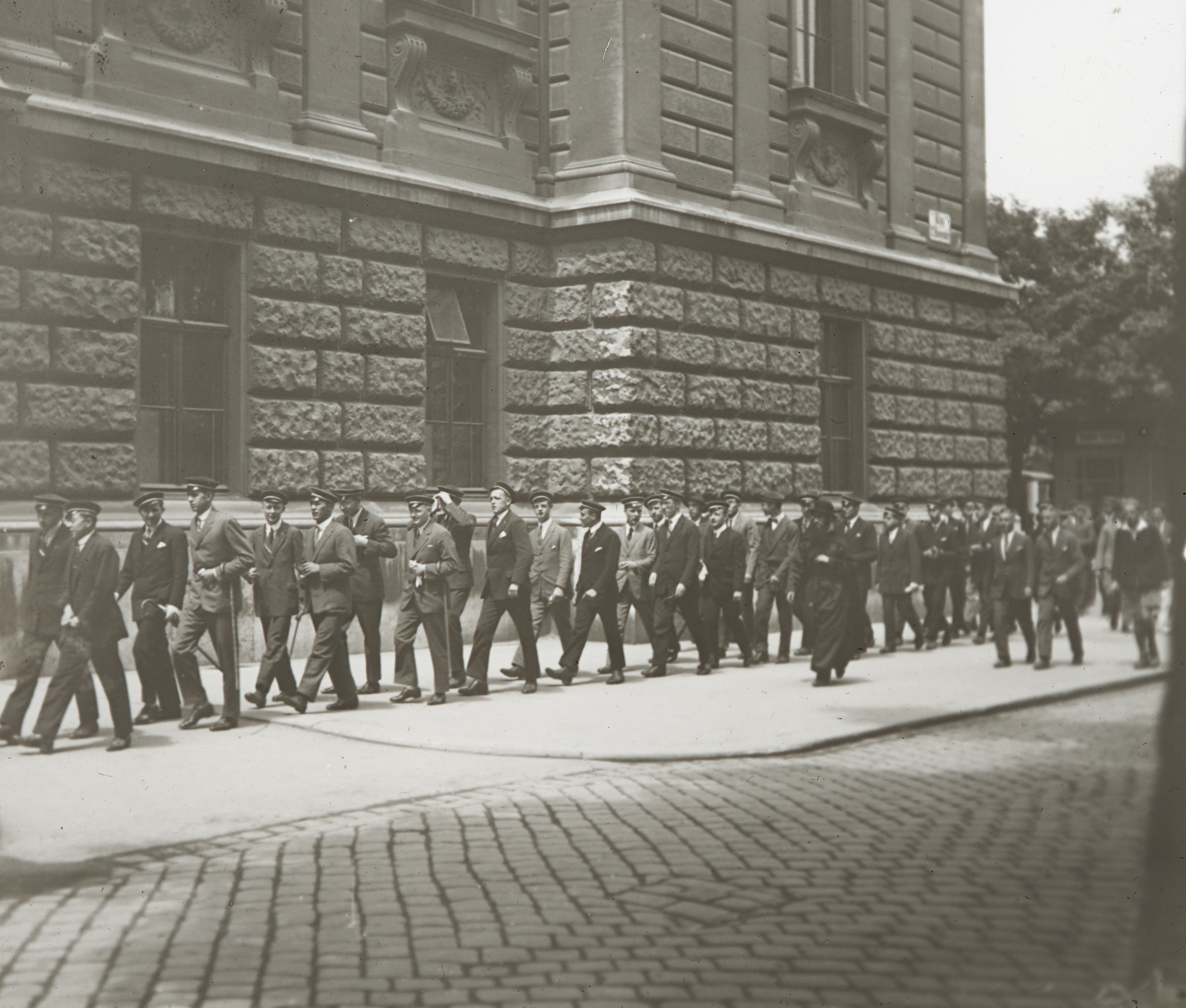 Vor einem Gebäude marschiert eine Gruppe von Menschen.