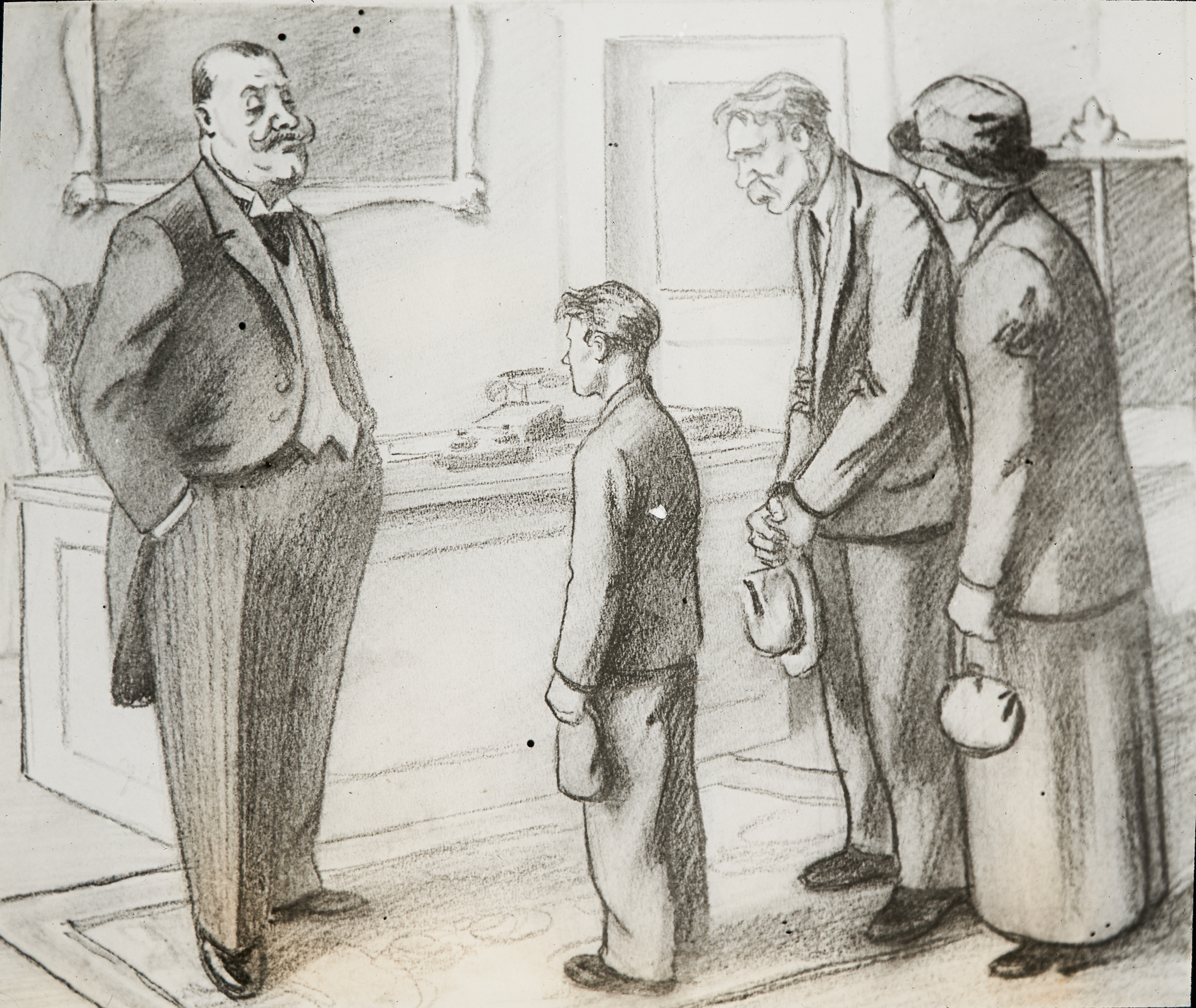 Drei Männer stehen in einer Schlange vor einem großen, kräftigen Mann. Im Hintergrund ist ein Schreibtisch zu erkennen.