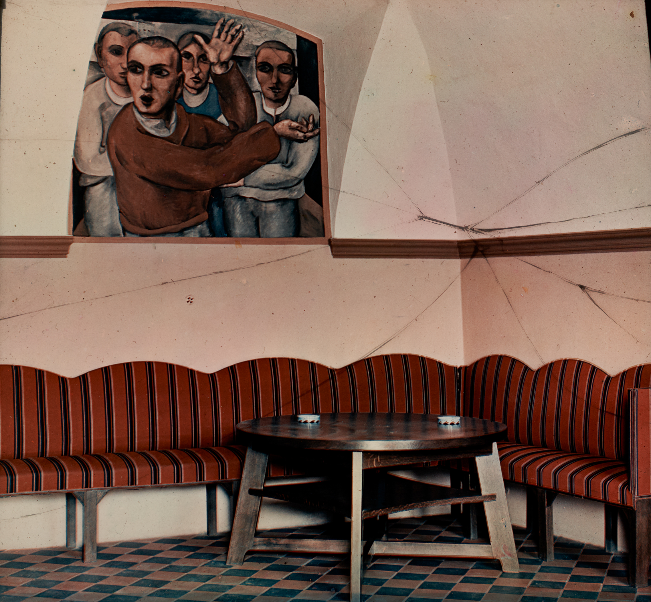 An dieser Eckbank befindet sich ein Tisch, auf dem zwei Aschenbecher stehen. Auf der linken Wand, über der Bank, befindet sich ein Gemälde.