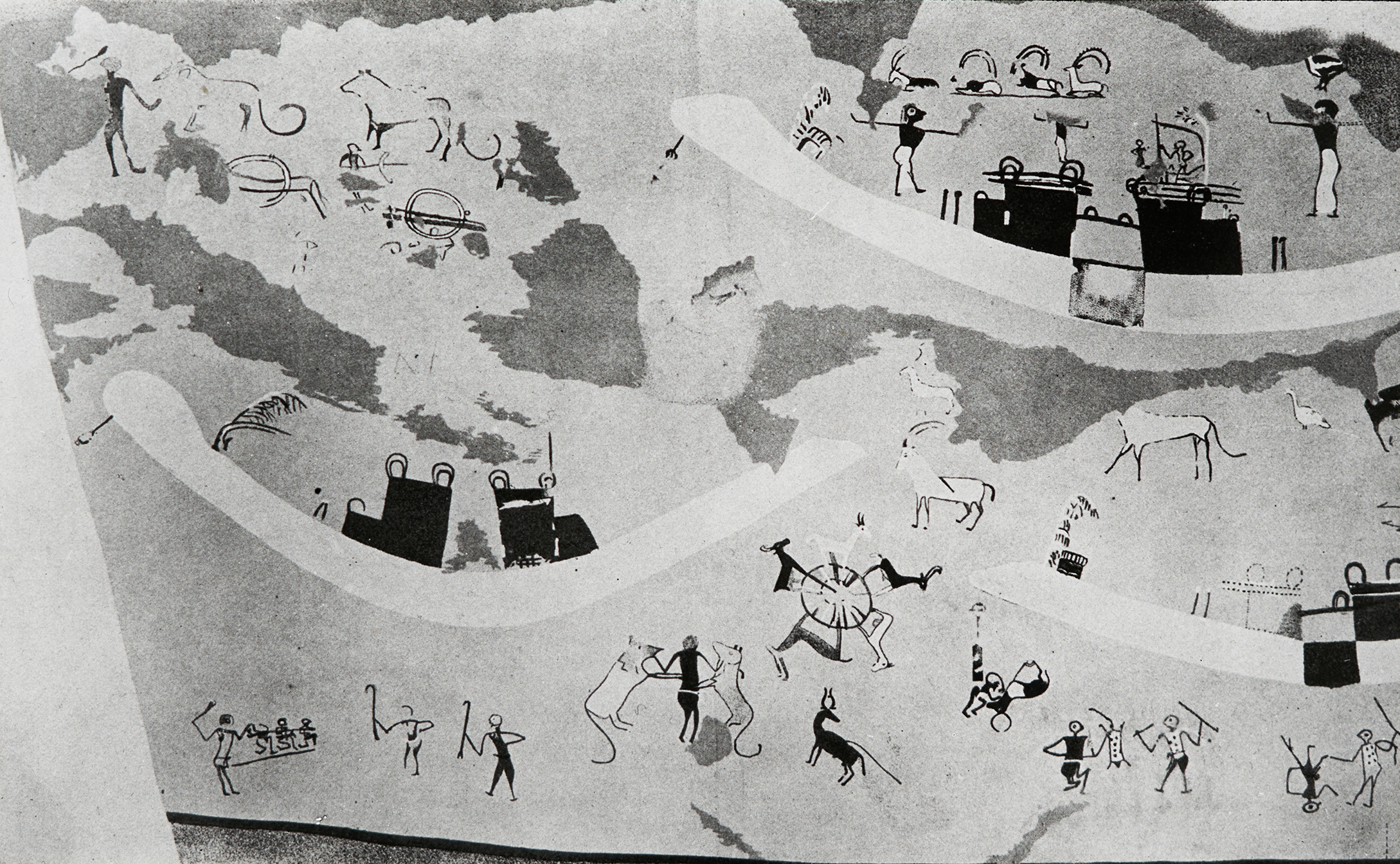 Diese Wandmalerei stammt aus dem Grab 100 in Hierakonpolis in Ägypten. Sie zeigt, Menschen, Tiere und Boote.