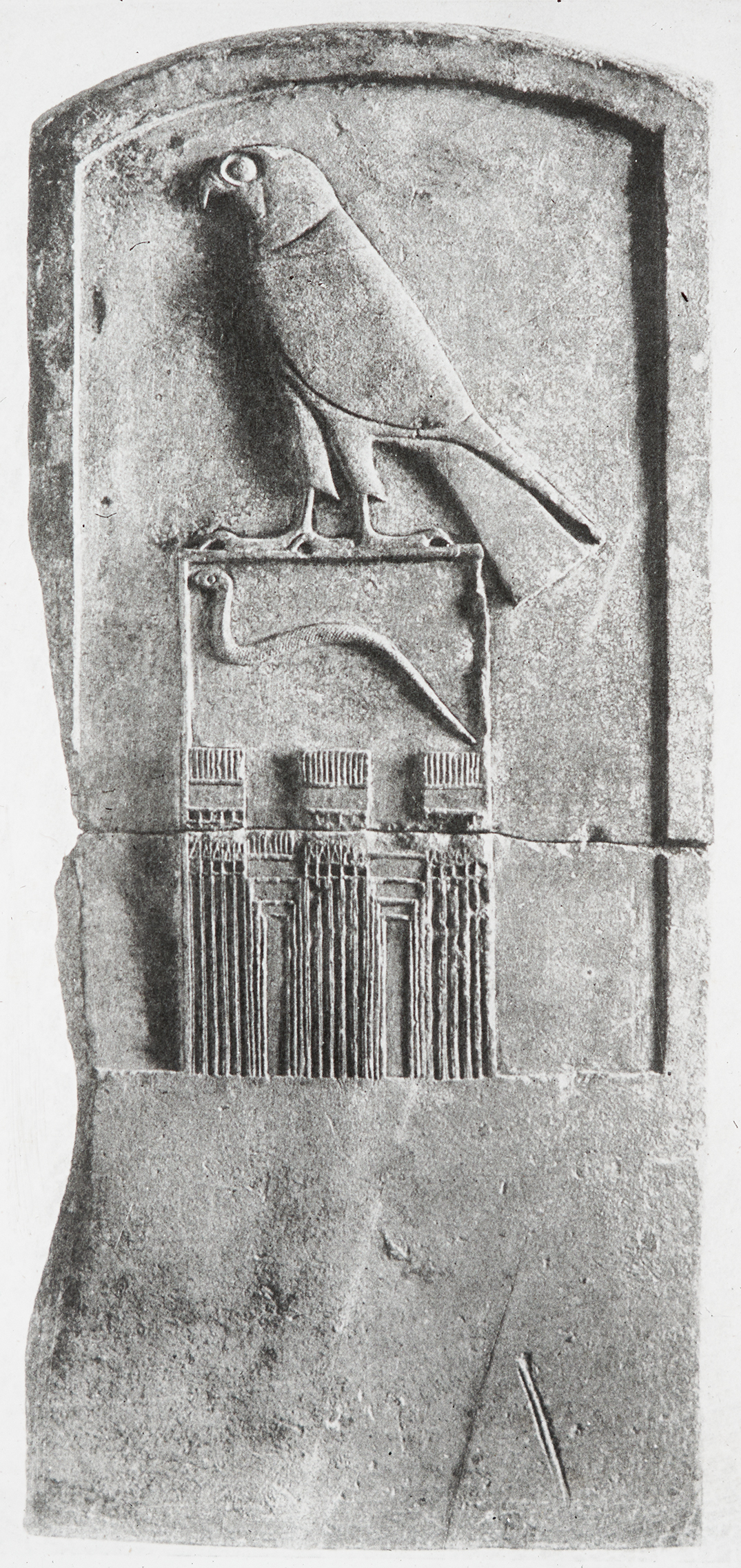 Dieses Steinbild befindet sich im Louvre-Museum in Paris. Es zeigt den Horusfalken und den Namen des Pharao Wadji. "Serech" ist der Begriff für ein hochgestelltes Rechteck, über dem ein Falke steht.
