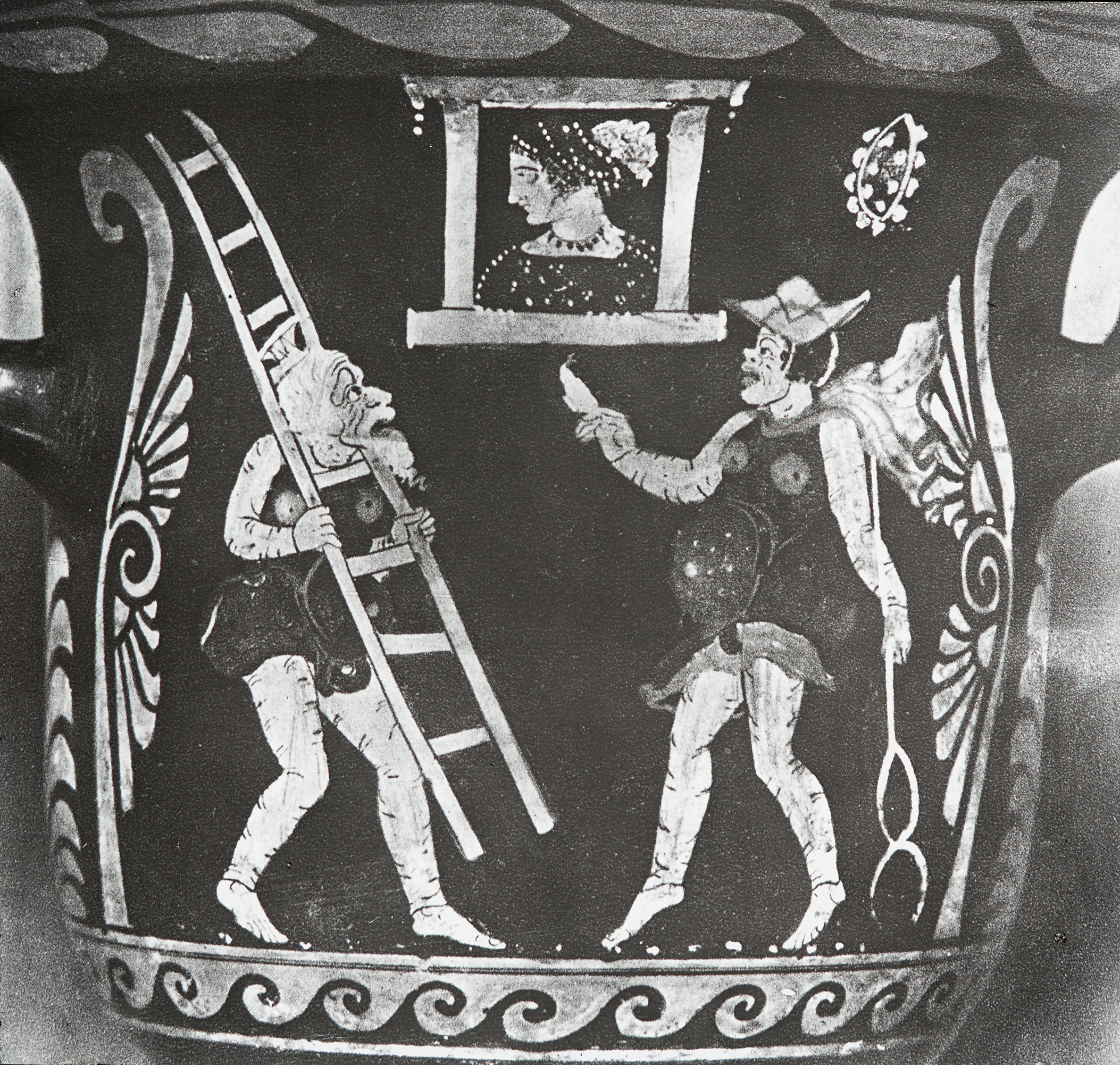 Der Glockenkrater von Assteas zeigt Zeus mit einer Leiter und seinen Sohn Hermes. Die Beiden befinden sich unter einem Fenster, durch das man eine Frau erkennt.
