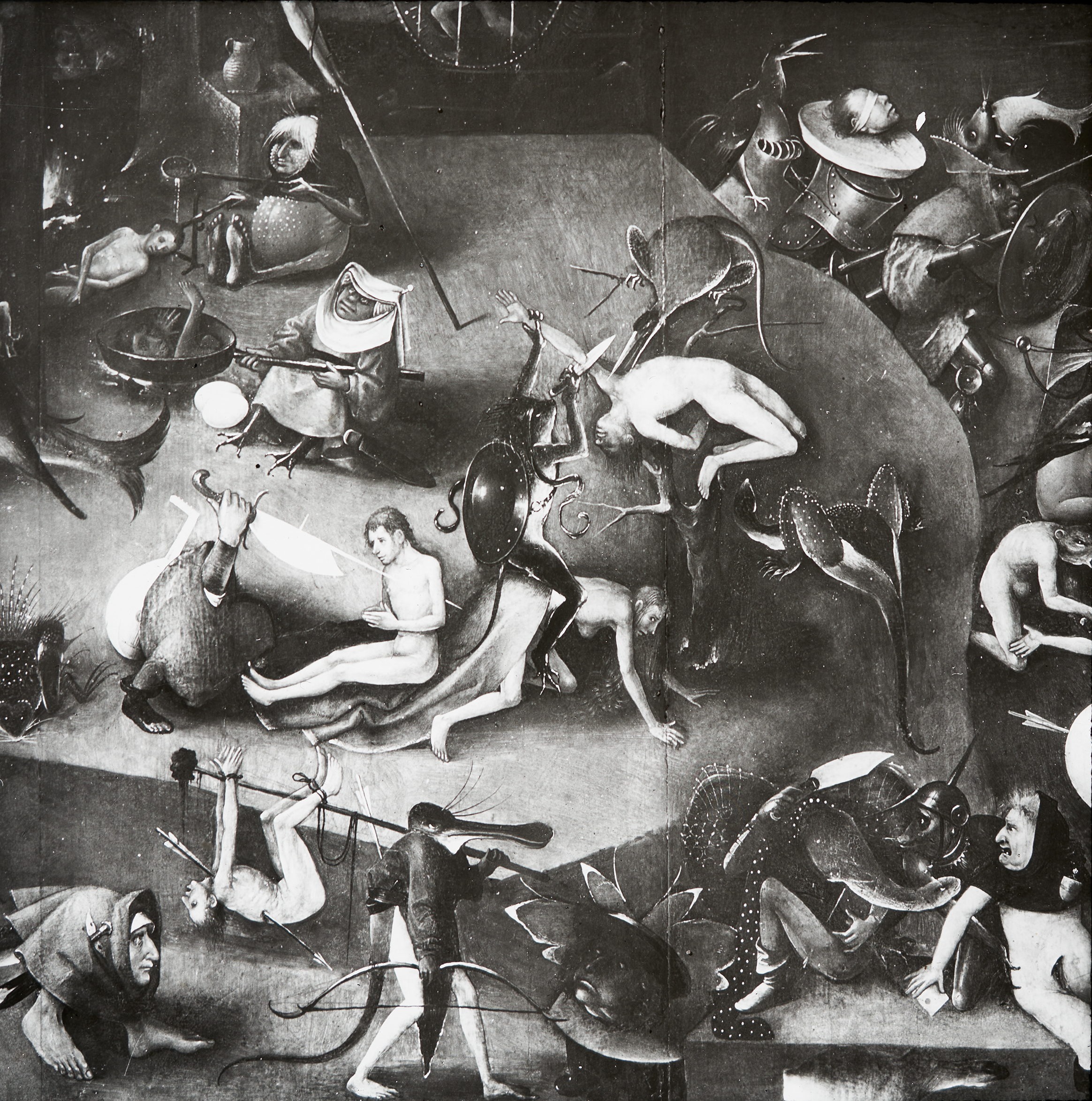 Zu sehen ist ein Ausschnitt des mittleren Teils des "Weltgericht-Tryptichon" von Hieronymus Bosch. Das Gemälde zeigt sämtliche sündvolle Aktivitäten des Menschen.