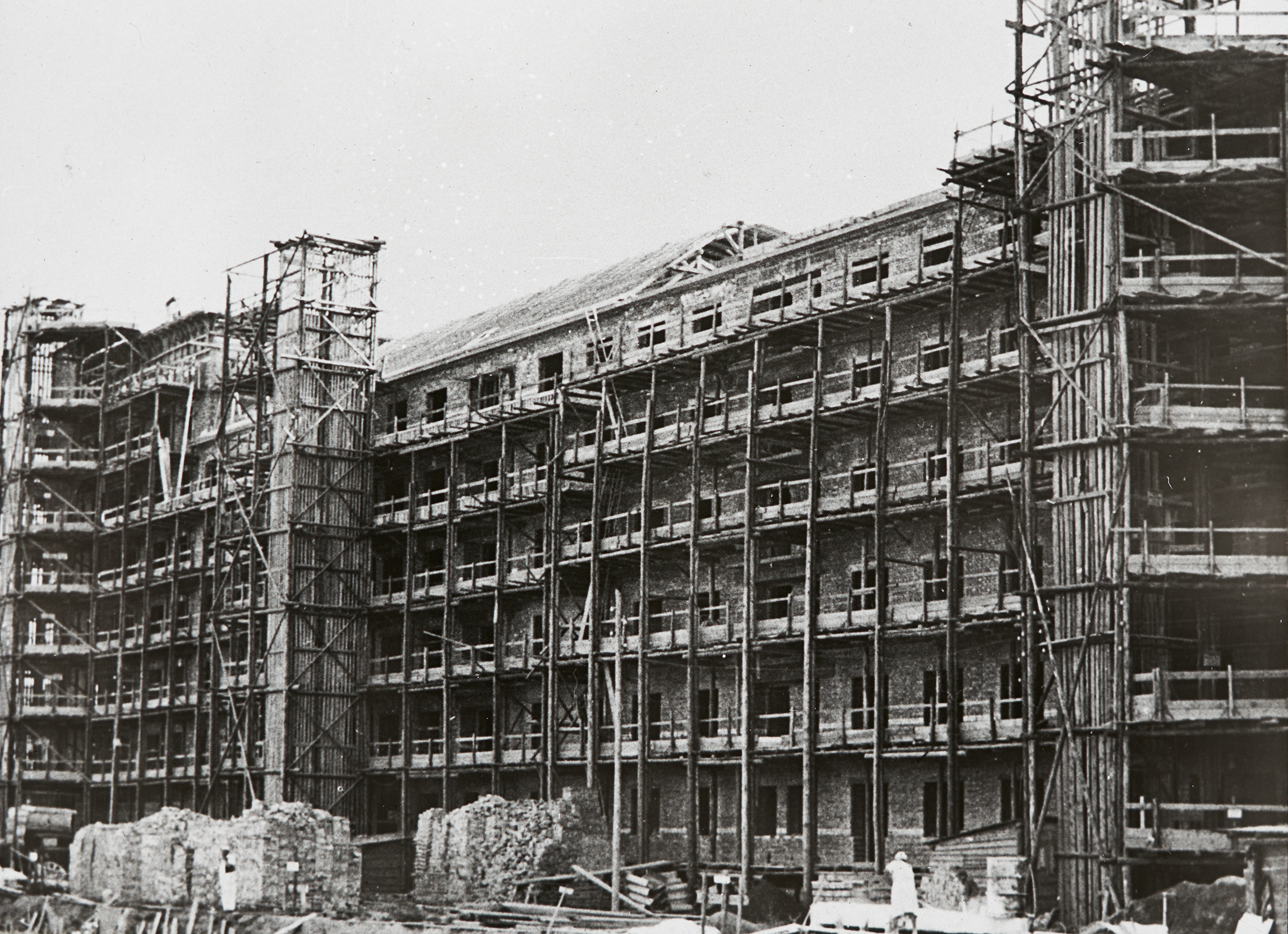 Diese Zeichnung zeigt Arbeiter beim Bau eines Doms.