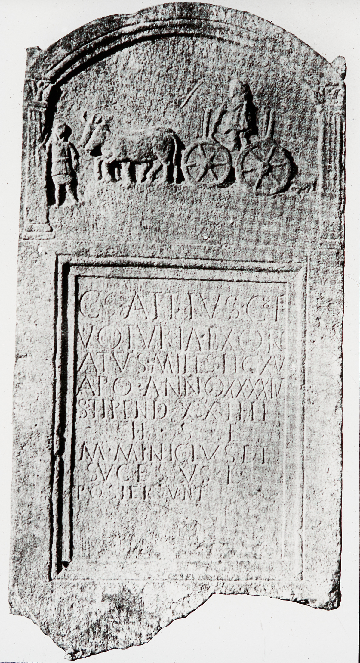 Dieser Grabstein wurde bei einer Grabung in Bad Deutsch Altenburg in Niederösterreich gefunden. Oben auf dem Grabstein ist eine Ikonographie, die einen Mann auf einem Wagen, zwei Zugtiere und einen weiteren Mann zeigt. Darunter befindet sich eine Inschrift.