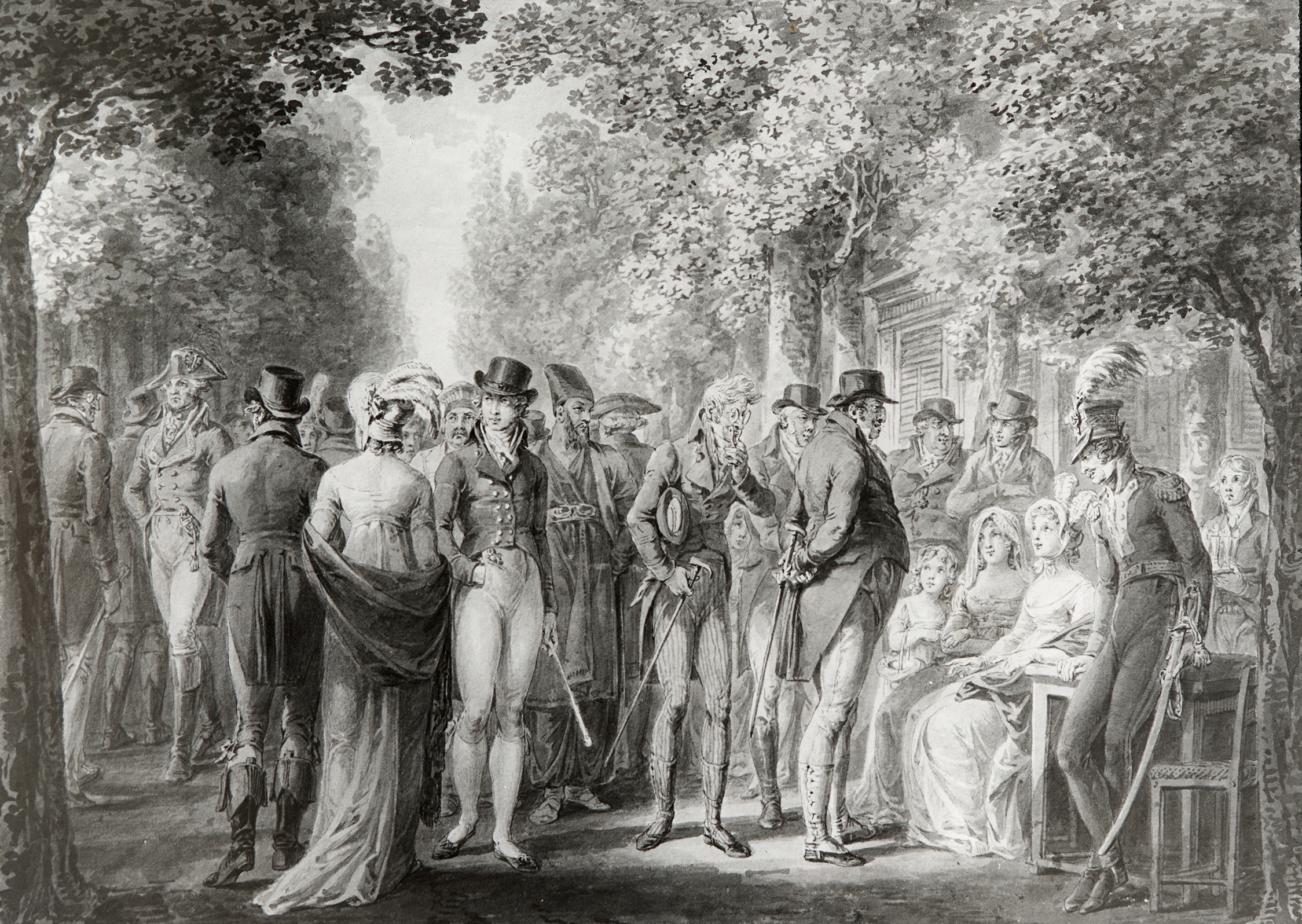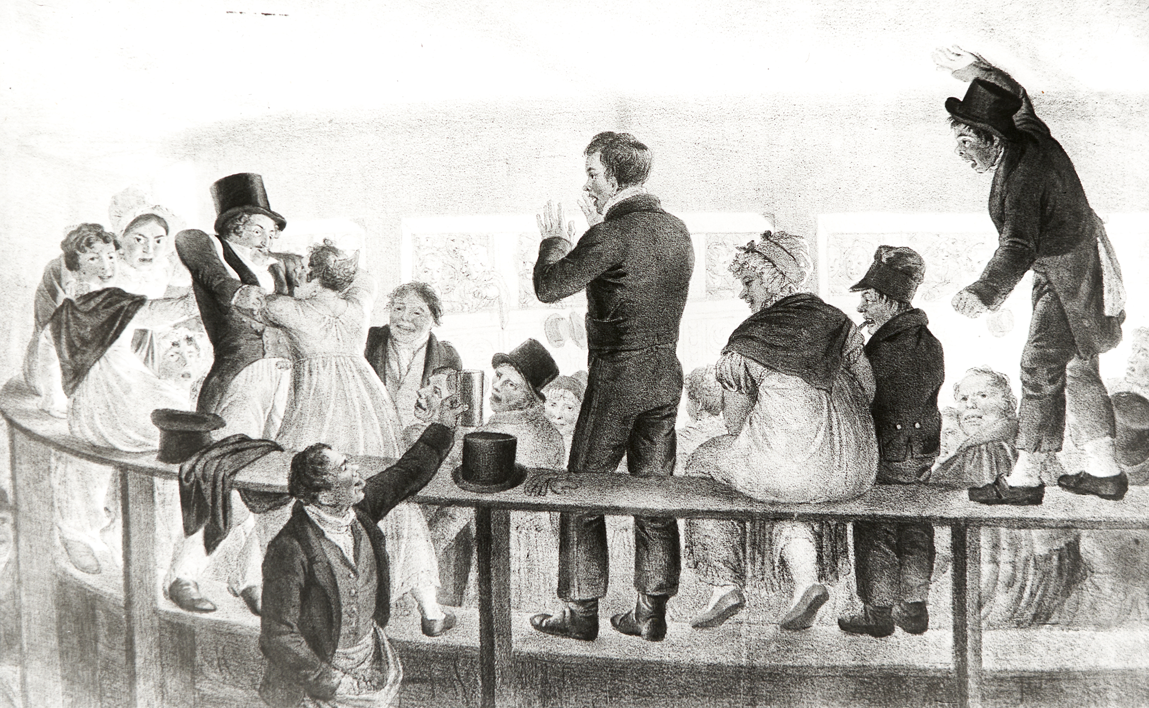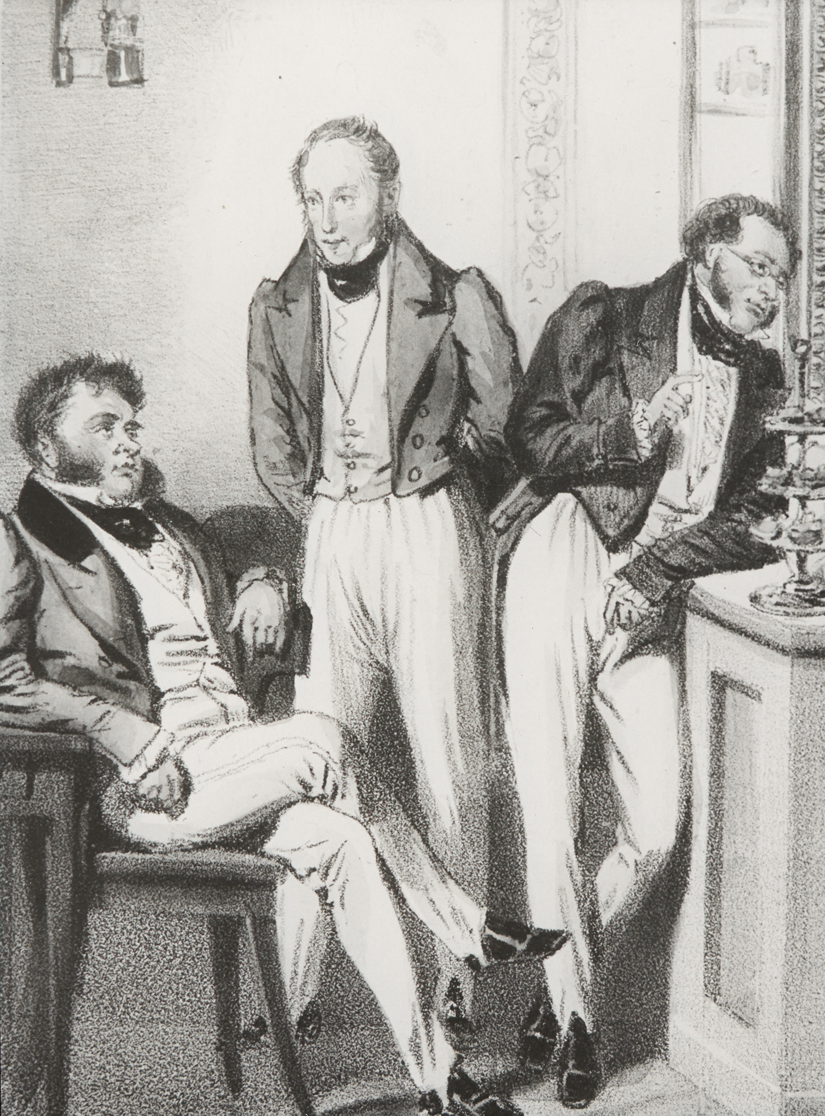 Hier sieht man eine Nahaufnahme der Lithographie "Die Kassierin vom silbernen Kaffeehaus". Sie zeigt die 3 Männer, die sich links am Bild befinden. Der Mann rechts ist Ignaz Franz Castelli.