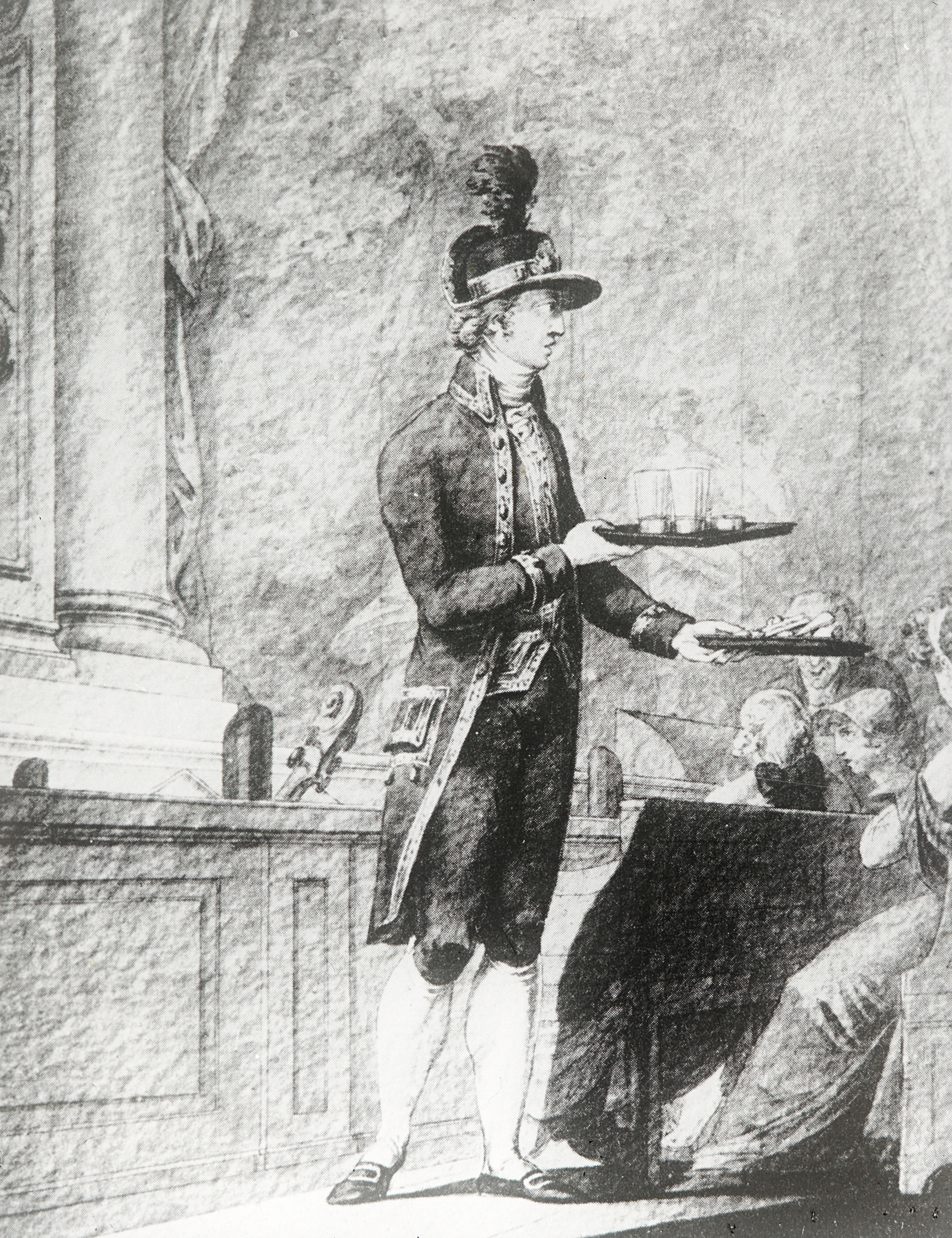 Numero. Numerierter Kellner oder Zuckerbäckerlehrling, der den Besuchern in den Theaterpausen Erfrischungen und Kanditen zum Kauf anbot.