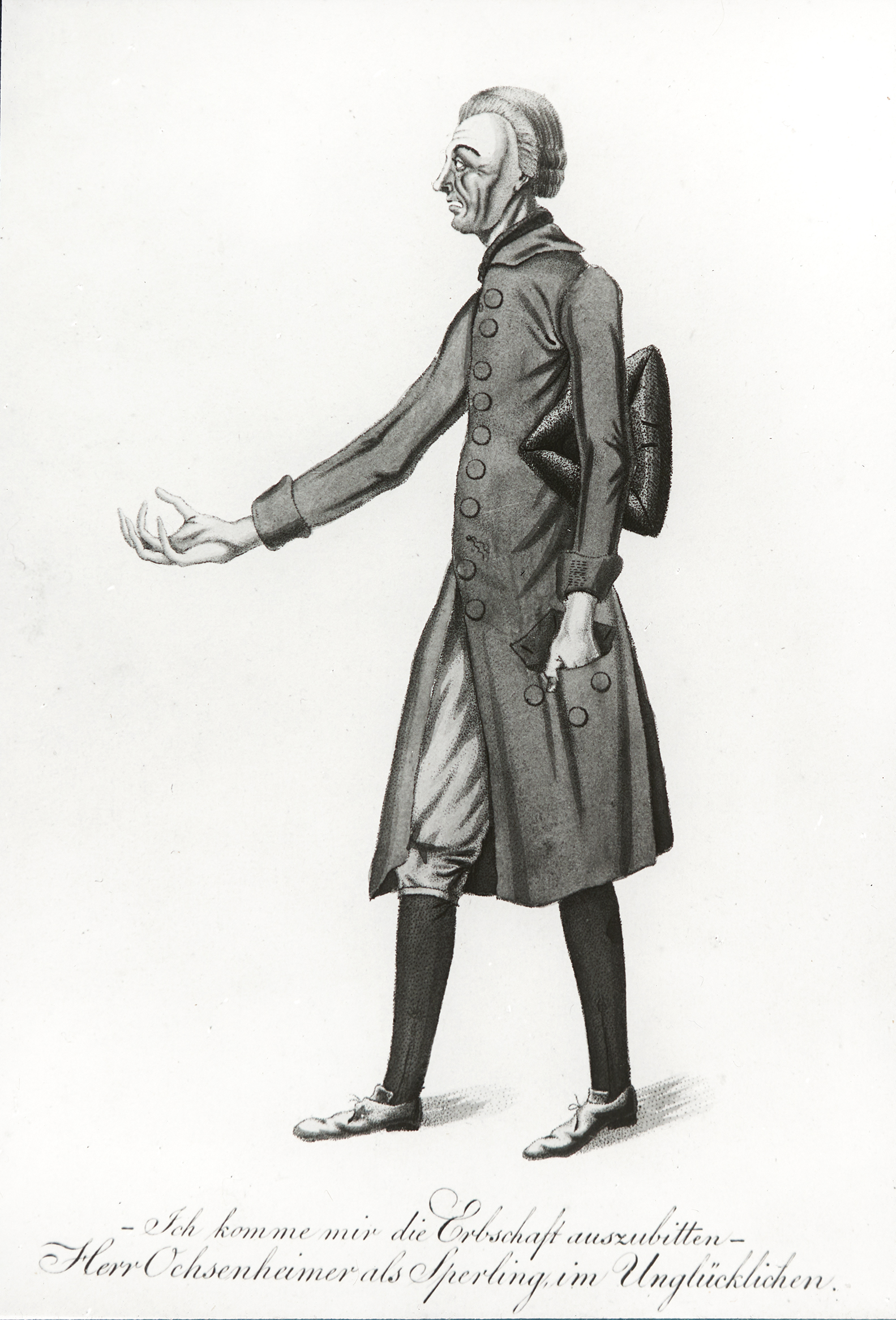 Ferdinand Ochsenheimer als Sperling im Unglücklichen. Ochsenheimer galt als vorzüglicher Charakterdarsteller, der in seinem Mienenspiel und der Art seiner Betonung mit August Wilhelm Iffland verglichen wurde. Bei seinen Auftritten in Wien vom 9. bis 26. Mai 1807 machte er mit seinen schauspielerischen Leistungen, vor allem mit seiner Mimik, großen Eindruck auf den österreichischen Schauspieler Ferdinand Raimund.