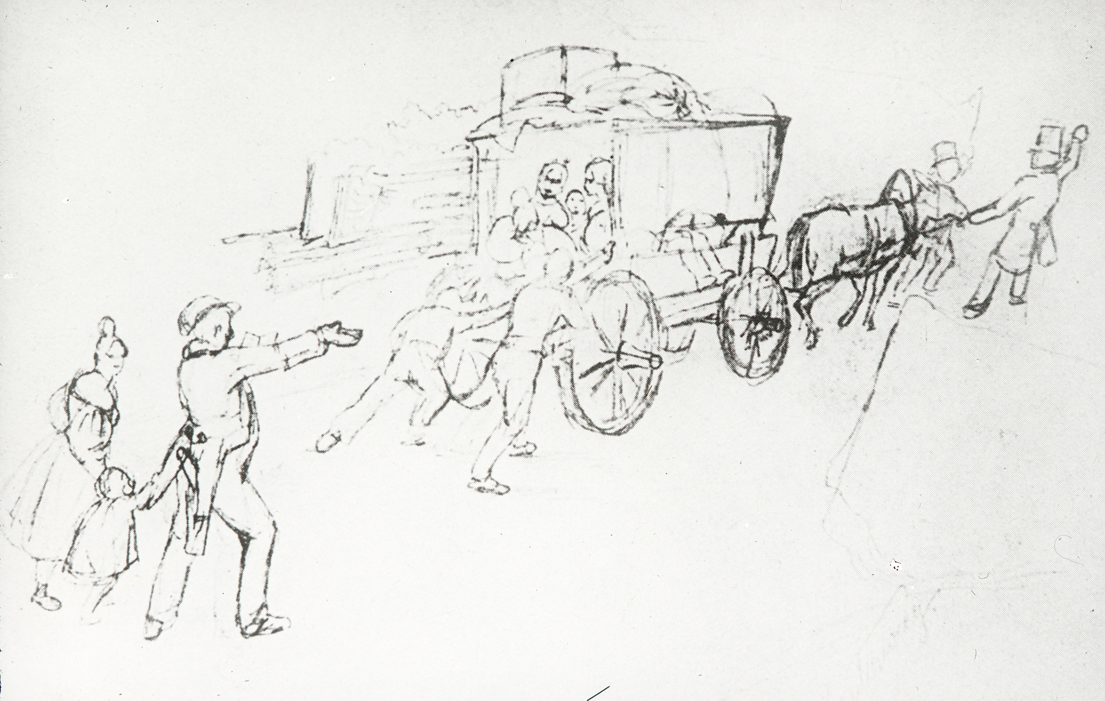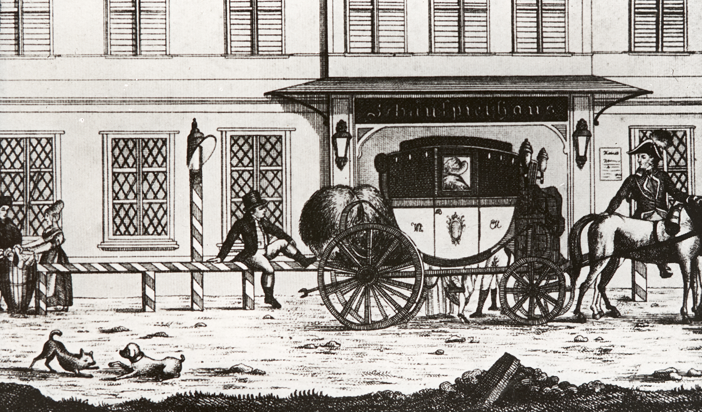 Die Reisekutsche befindet sich vor dem Eingang zu einem Schauspielhaus. Es deutet auf eine klassische Situation zu Anfang des 19. Jahrhunderts hin, Wanderschauspieler die von Ort zu Ort reisen um ihre Kunst darzustellen sind hier abgebildet.