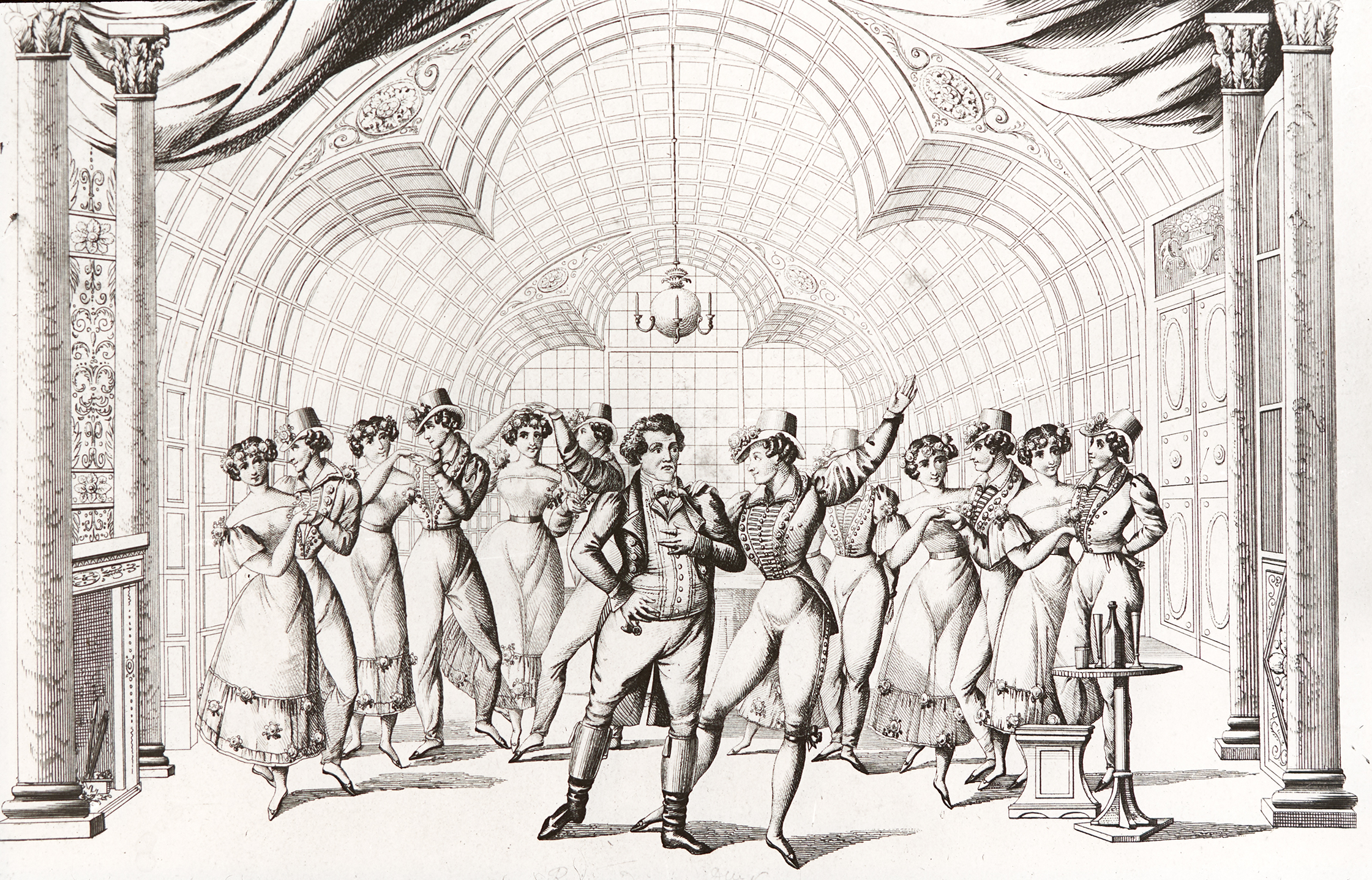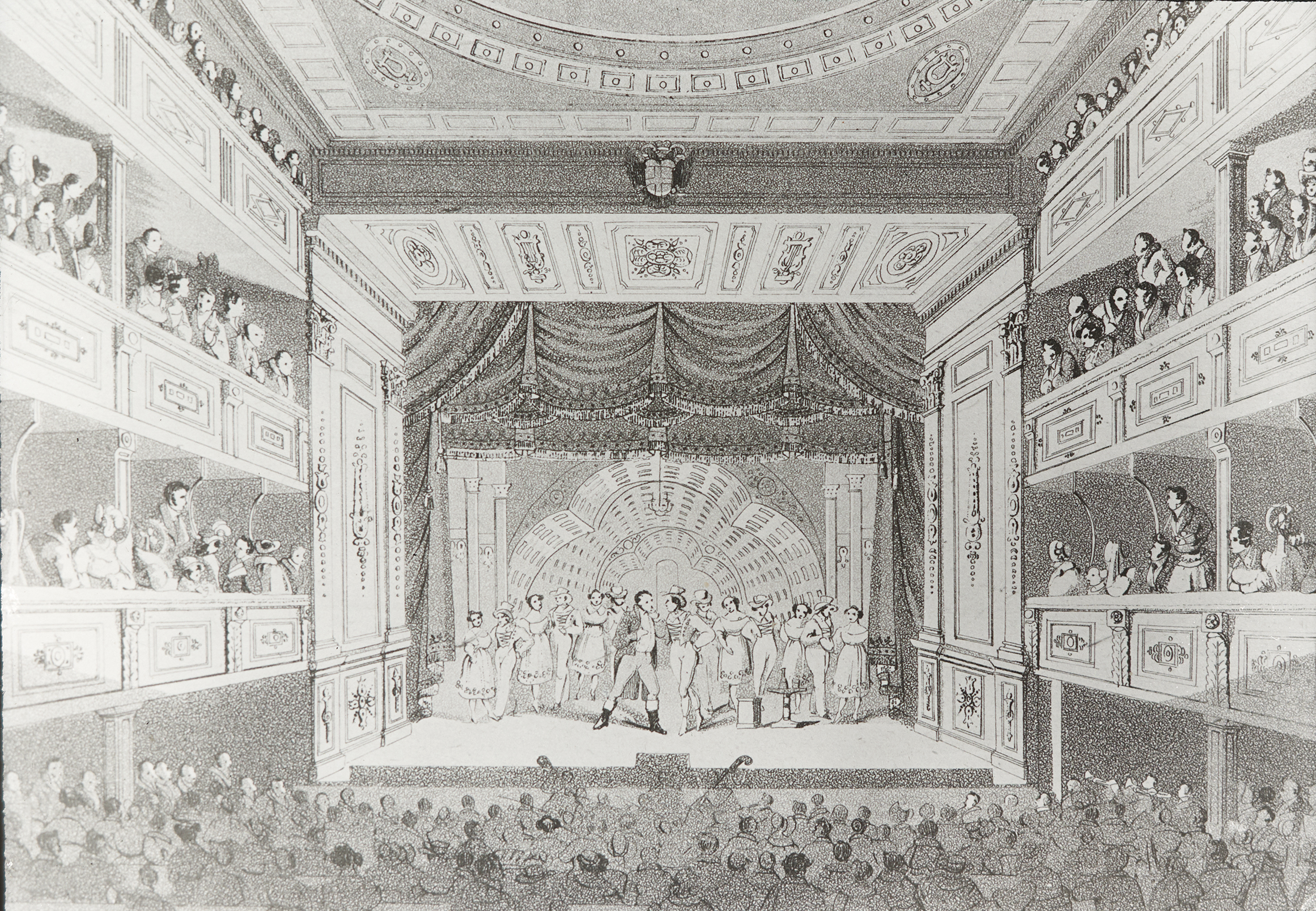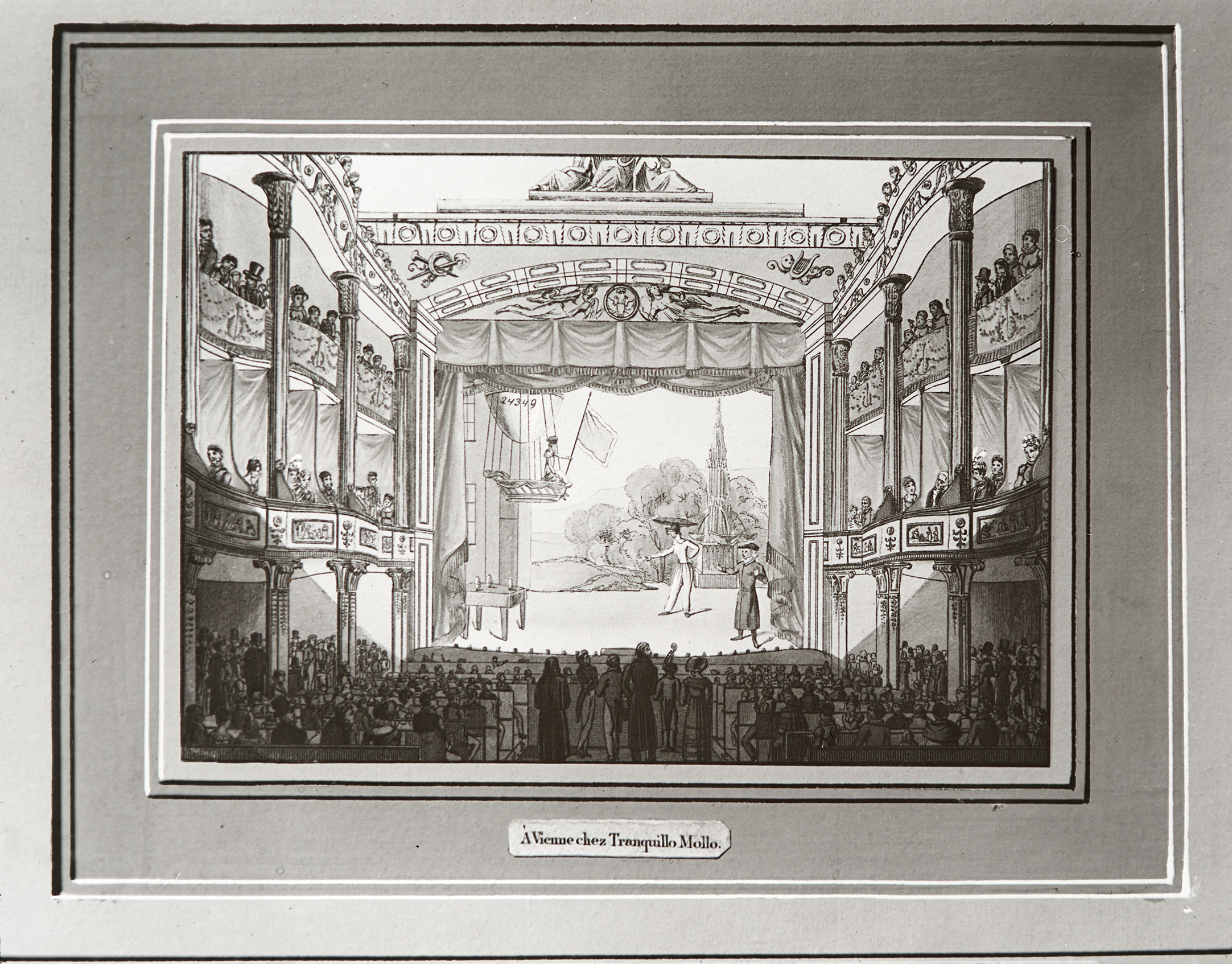 Intermezzo im Alten Leopoldstädter Theater. Ein Zwischenspiel im Theater ist eine Einlage zwischen den Akten oder Bildern eines Dramas. Die Einlage diente als Ruhe- und Umkleidepause für die Schauspieler und zum Wechsel des Bühnenbilds. Daher fand sie oft auf der Vorbühne vor dem Hauptvorhang statt. Neben den Zwischenspielen gab es Vor- und Nachspiele, die inhaltlich auch nicht unbedingt mit dem Hauptspiel verbunden waren.