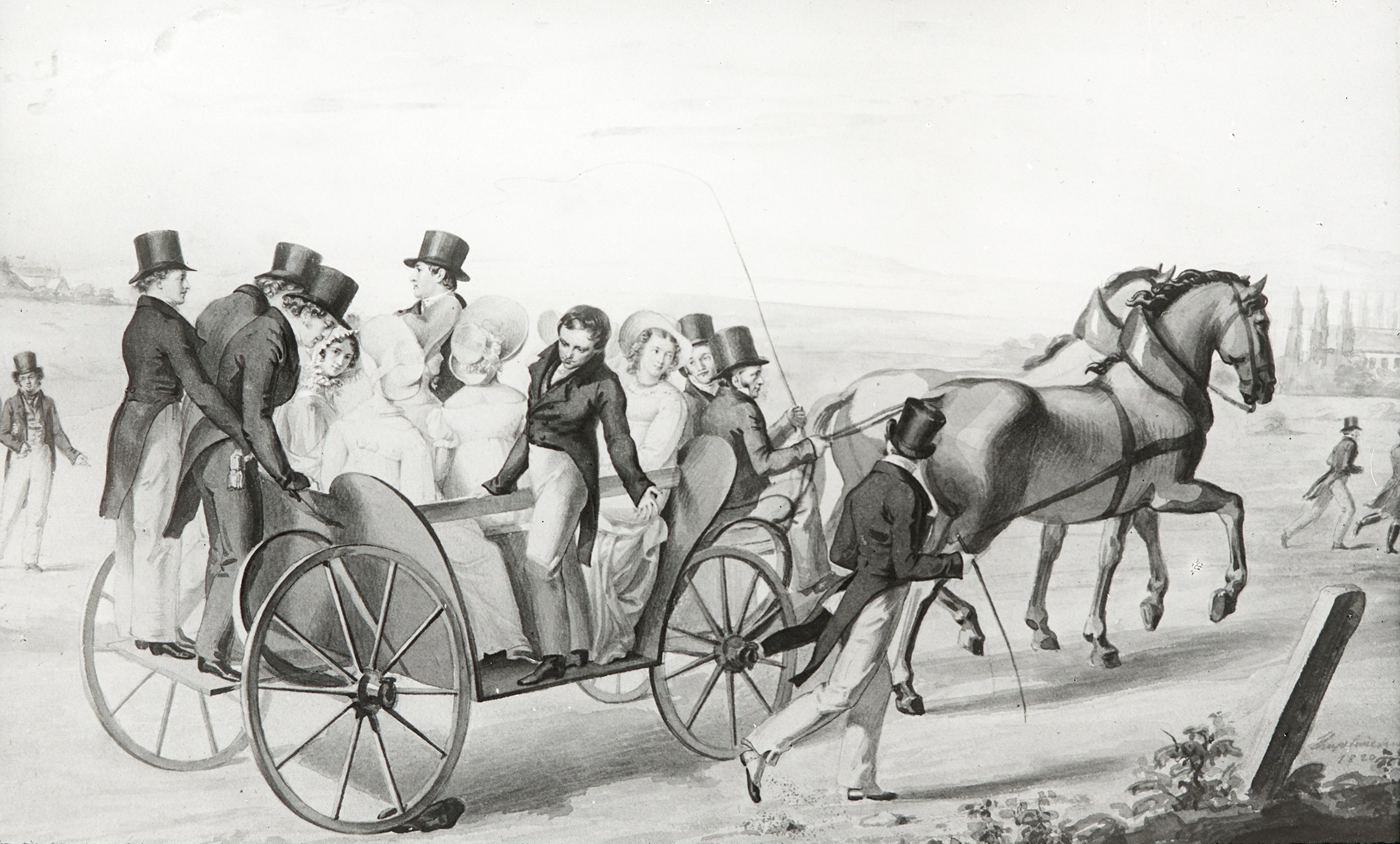 Ausfahrt der Schubertianer Landpartie. Schubert, im Bild links, bei einem Ausflug mit seinen Freunden. Mehrmals weilte Franz Schubert mit seinen Freunden im Schloss Atzenbrugg, das damals im Besitz des Stiftes Klosterneuburg war.