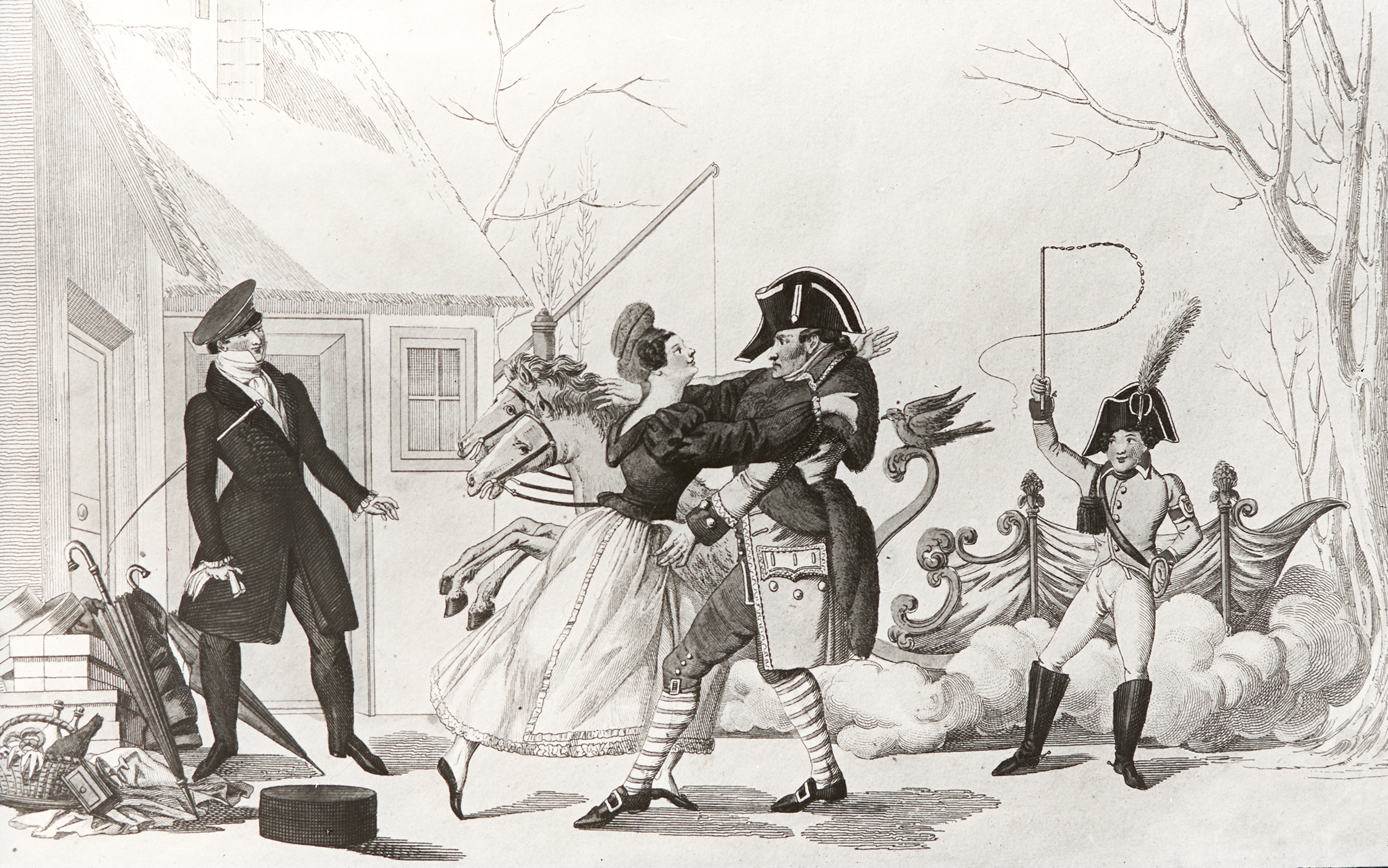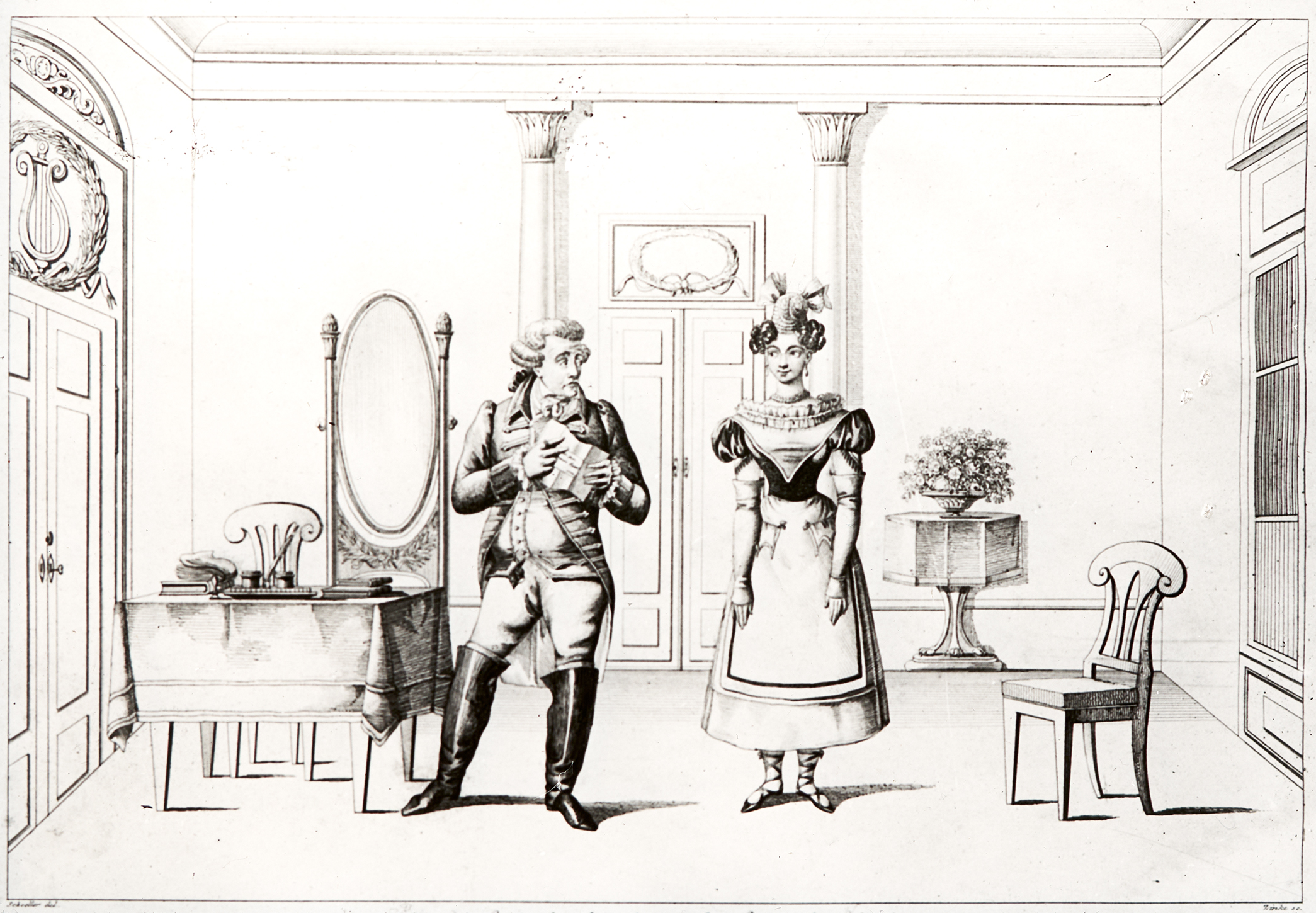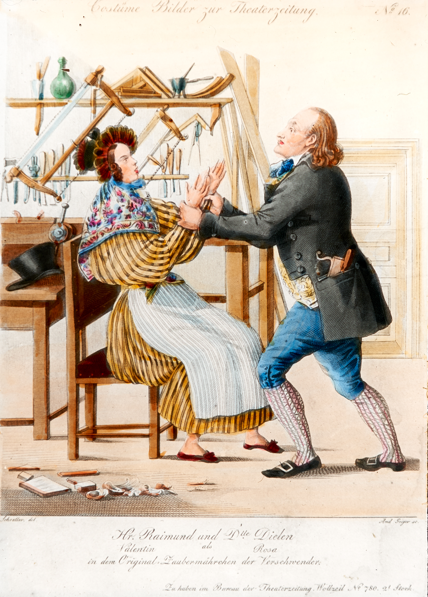 Therese Krones und Ferdinand Raimund in Krones "Sylphide das Seefräulein". Uraufgeführt am 15. Februar 1828 verkörpert Krones Cyprian Scheermaus und Raimund Eustachius Wolferl.