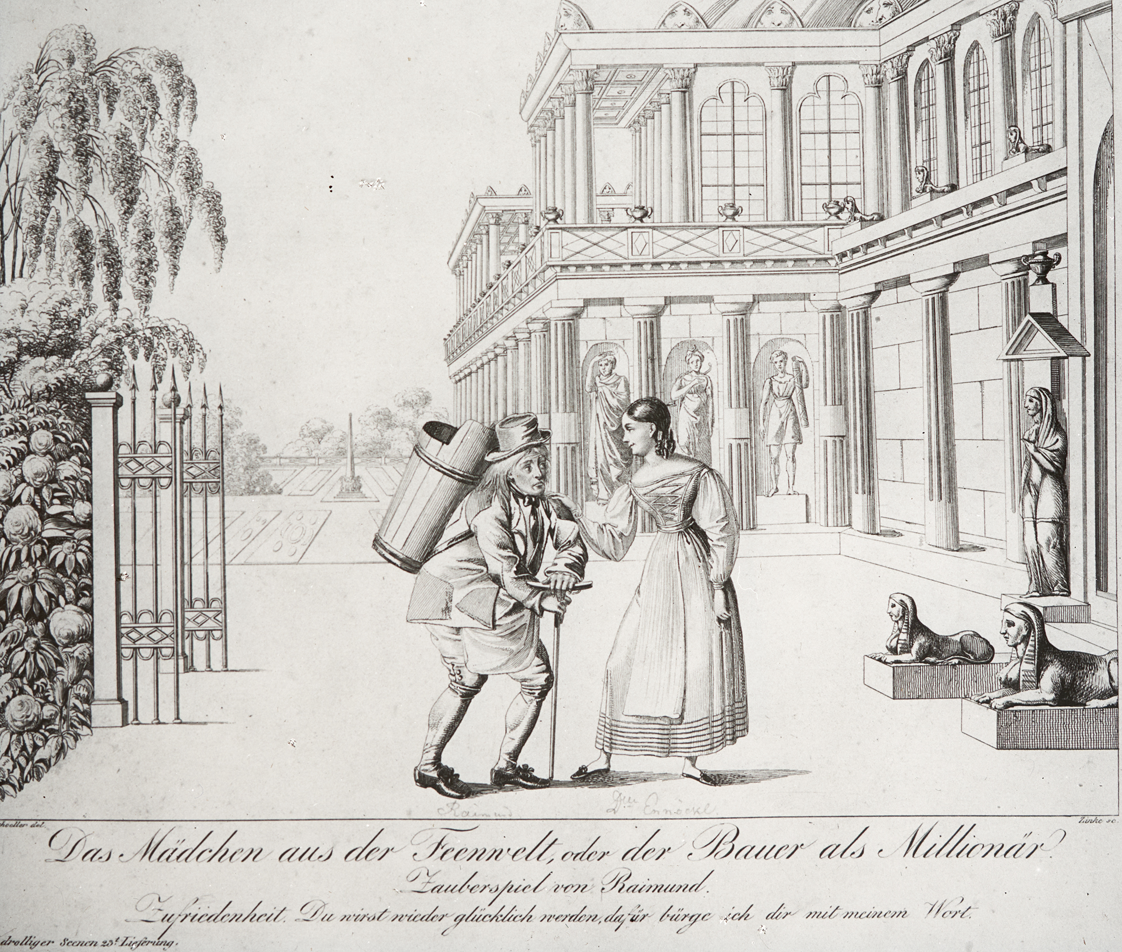Raimund und Krones im Raimundschen Zauberspiel "Das Mädchen aus der Feenwelt oder: Der Bauer als Millionär", dargestellt in der bekannten Szene: "Alles hat man in der Welt! Jugend kriegt man nicht fürs Geld. Brüderlein fein, Brüderlein fein. Musst mir ja nicht böse seyn!"