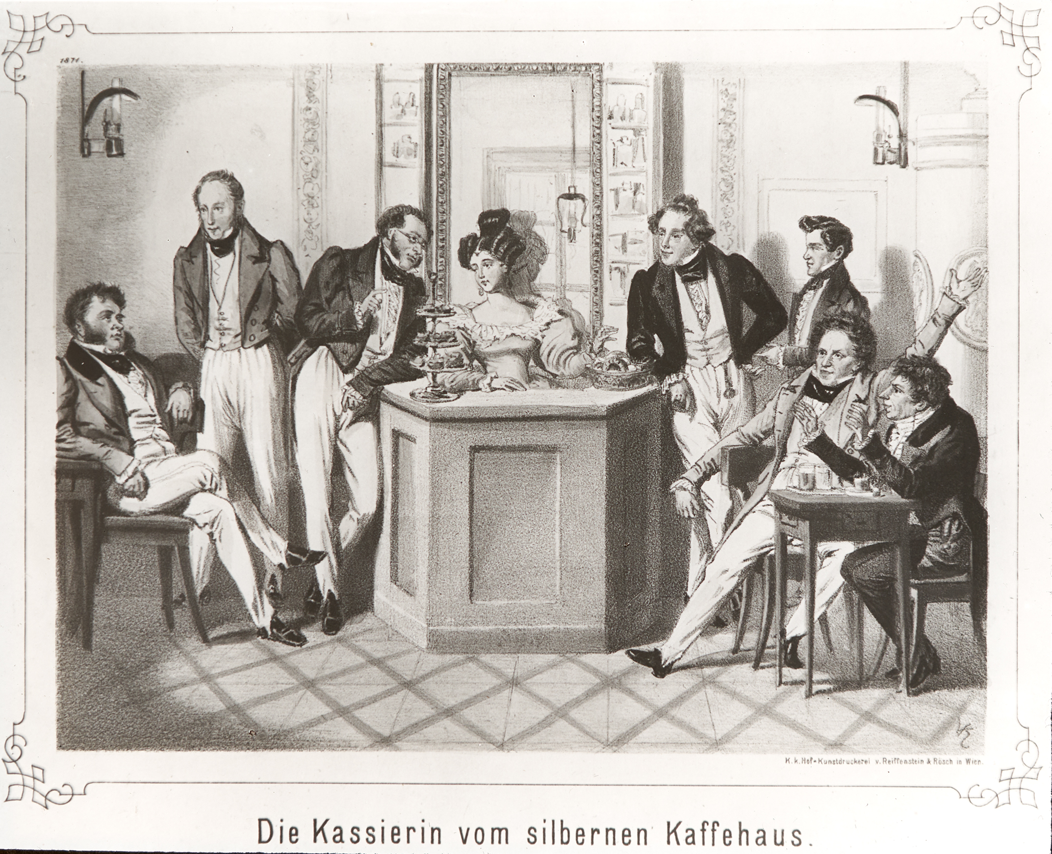 Hier zu sehen sind unter anderem Ferdinand Raimund, Johann Strauss Vater, Joseph Lanner und Ignaz Franz Castelli, in einer geselligen Runde im Silbernen Kaffeehaus um 1825.