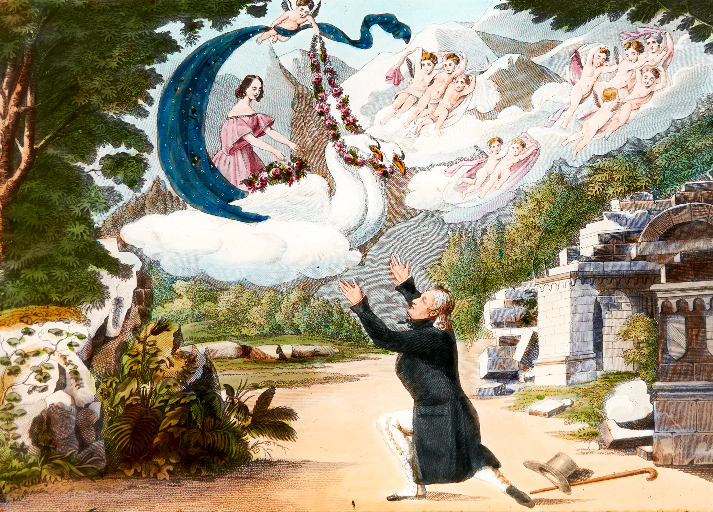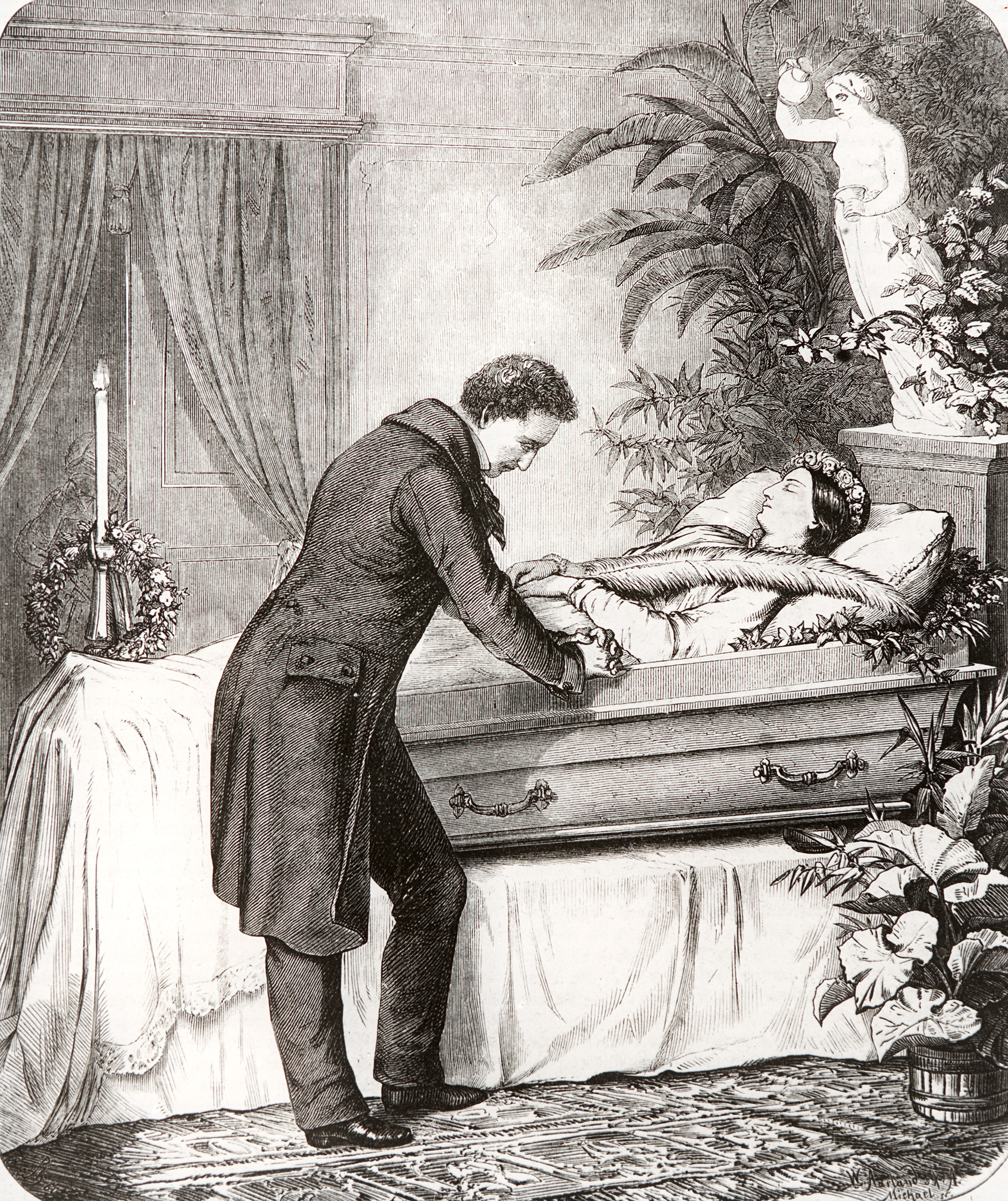 Ferdinand Raimund am Sarge seiner Jugend, gemalt von Albert Traeger, erschienen 1861. Entnommen aus "Das Mädchen aus der Feenwelt oder: Der Bauer als Millionär".