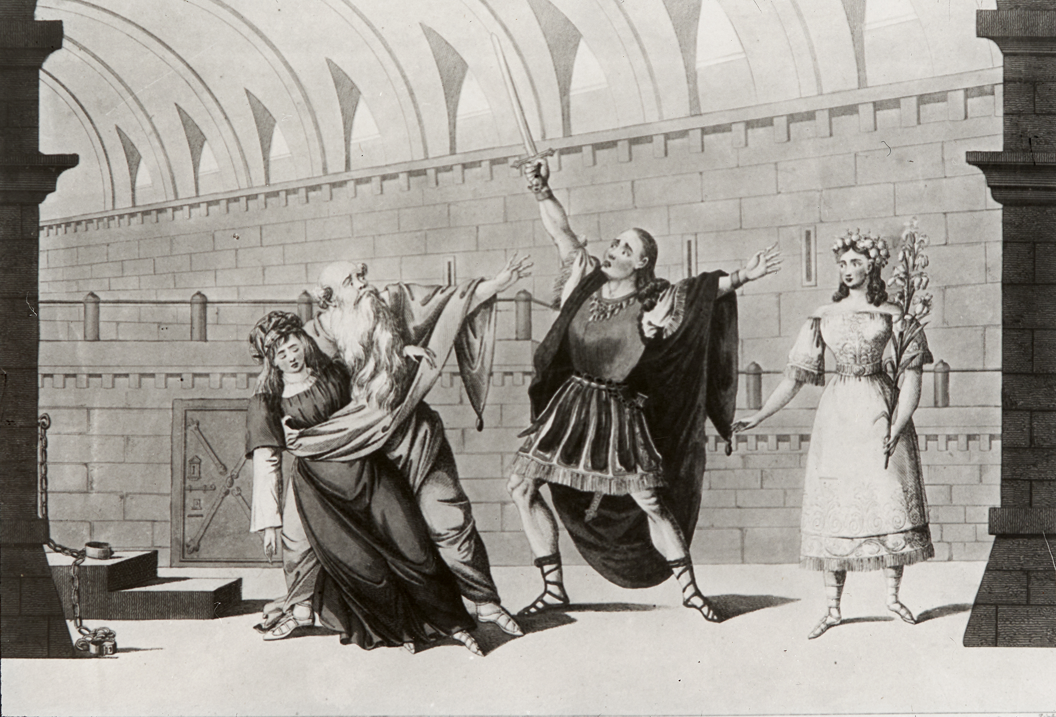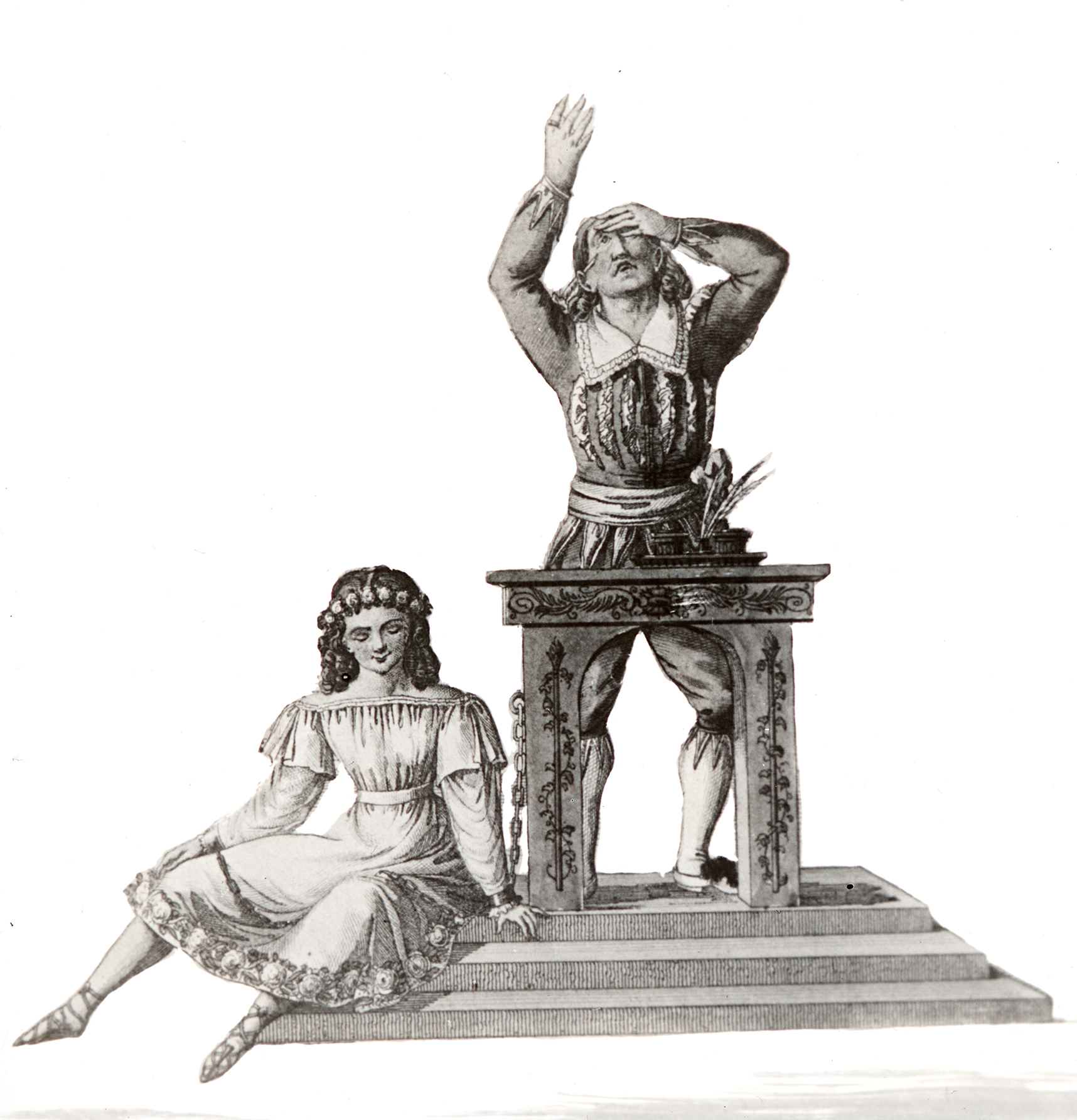 Ausschnitt aus einem Szenenbild, die gefesselte Phantasie kann dem Harfenisten Nachtigall nicht helfen.