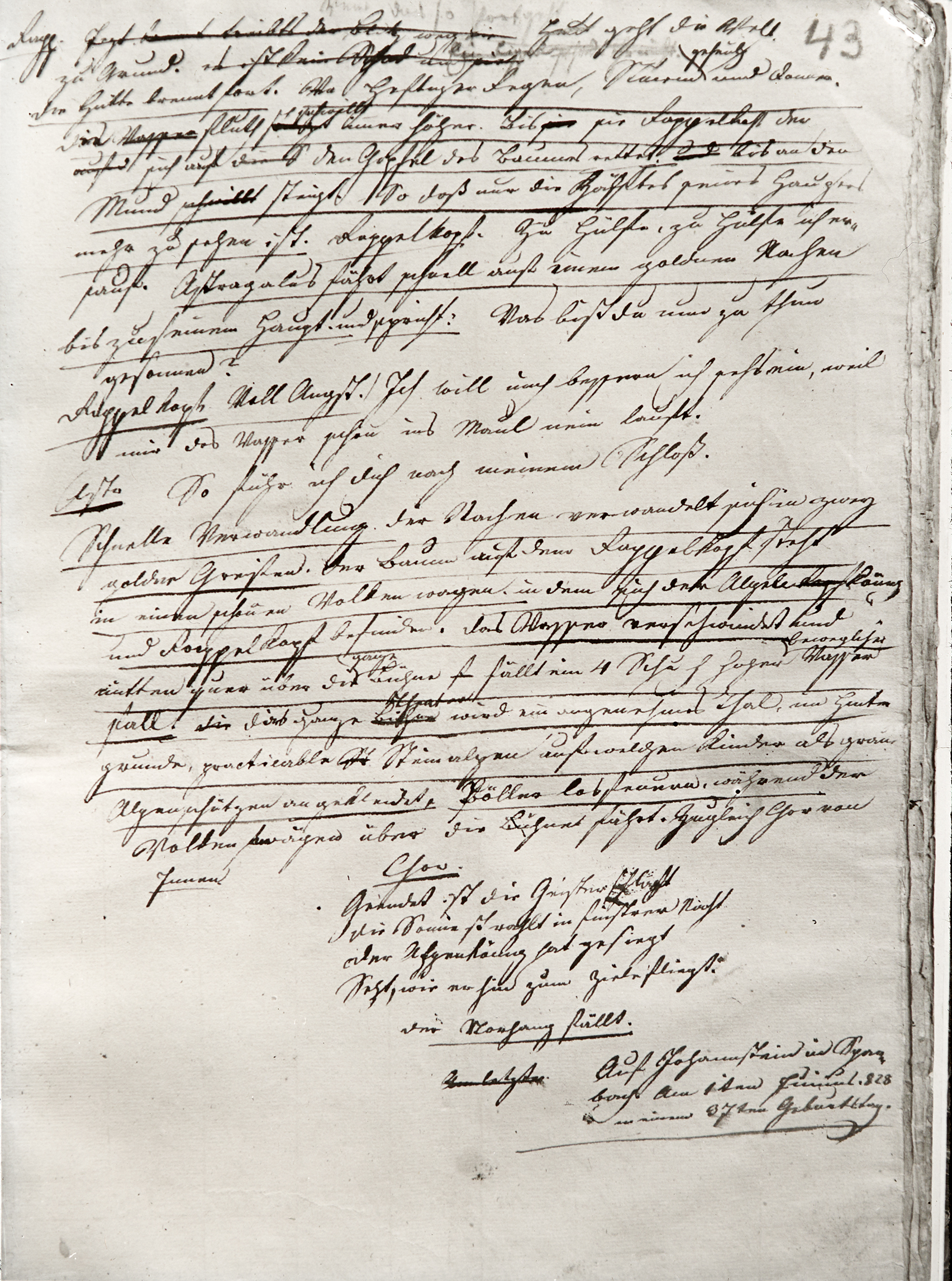Zu sehen ist ein handschriftlich verfasstes Original-Manuskript zu Raimunds "Der Alpenkönig und der Menschenfeind".