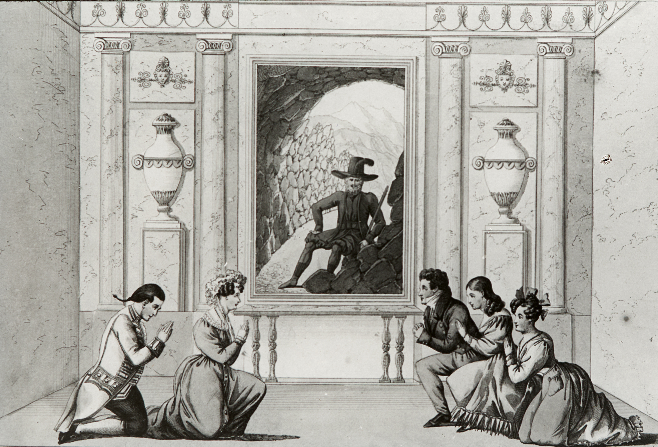Szenenbild aus "Der Alpenkönig und der Menschenfeind", einem der erfolgreichsten Komischen Zauberspiele von Ferdinand Raimund. Erschienen ist dieses BIld in der Wiener Theaterzeitung.