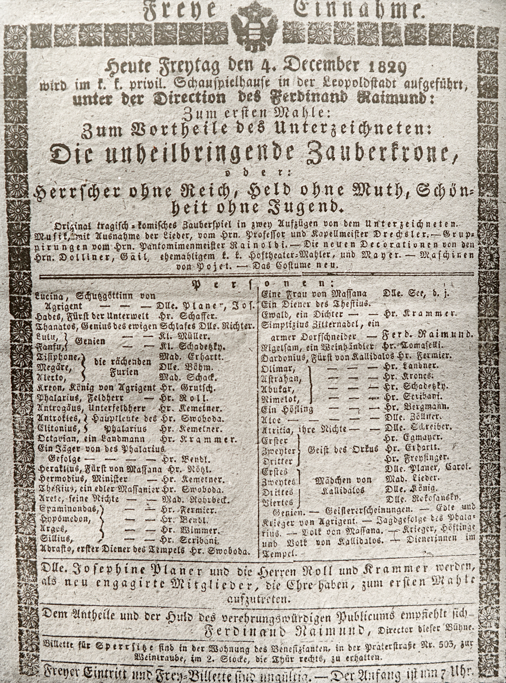 Hier findet sich ein Theaterzettel für die Uraufführung von Raimunds "Die unheilbringende Zauberkrone". Am 4. Dezember 1829 fand die erste Vorstellung des Stücks im Theater in der Leopoldstadt statt.