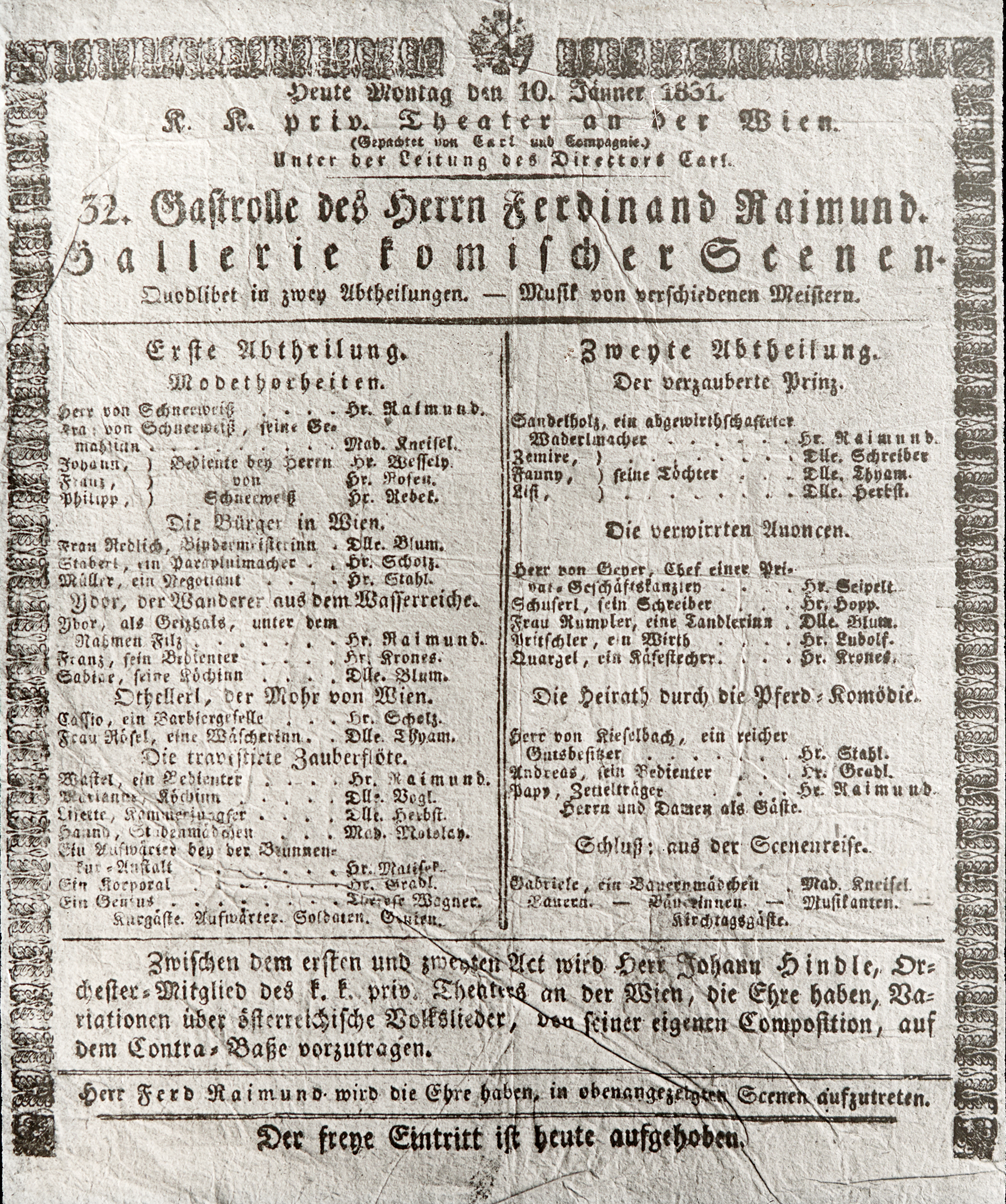 Theaterzettel für das Theater an der Wien. Ferdinand Raimund spielt seine 32. Gastrolle am Theater, am 10. Jänner 1831 in "Gallerie komischer Scenen".