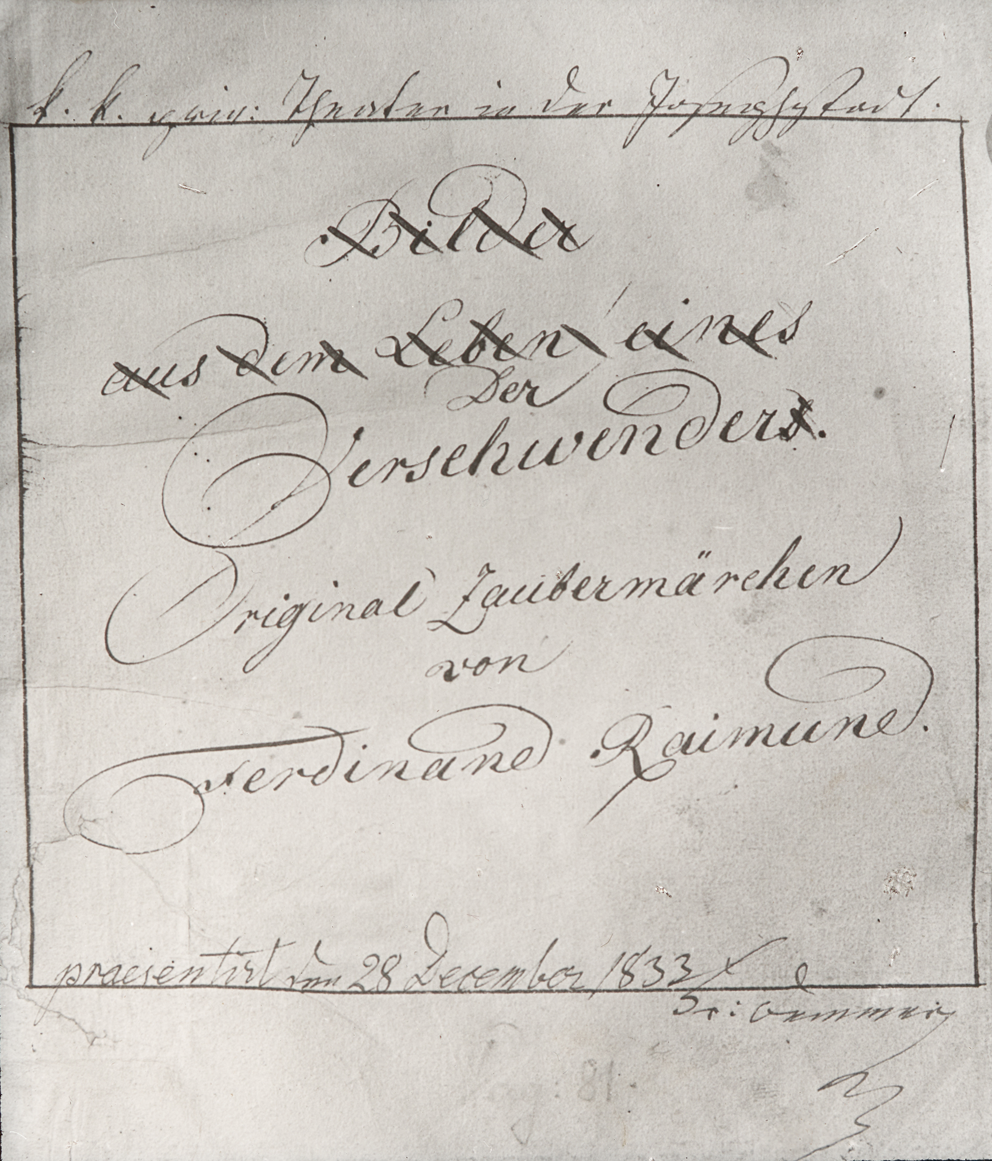 Das letzte von Raimund vorgestellte eigene Stück ist "Der Verschwender". Der erste Titel, "Bilder aus dem Leben eines Verschwenders" wurde später gekürzt und durch "Der Verschwender" ausgetauscht.