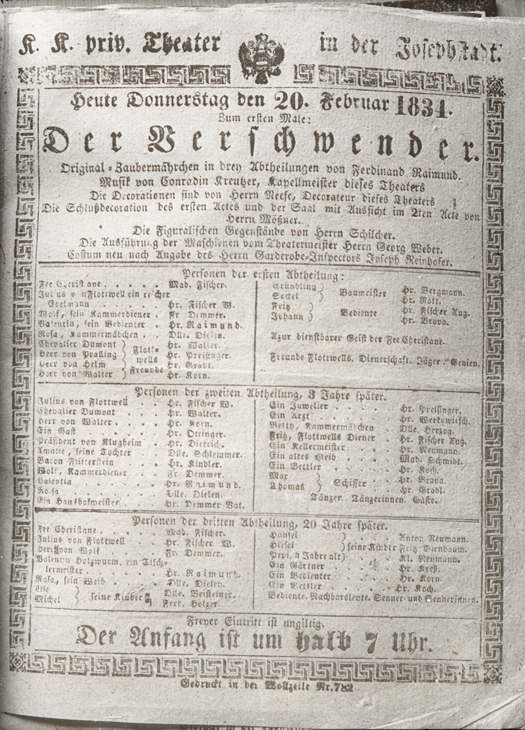 Programmblatt für die Uraufführung von "Der Verschwender" von Ferdinand Raimund. Am 20. Februar 1834 wurde das letzte von Raimund geschriebene Stück zum ersten Mal aufgeführt. Raimund schlüpft in die Rolle des Valentin.