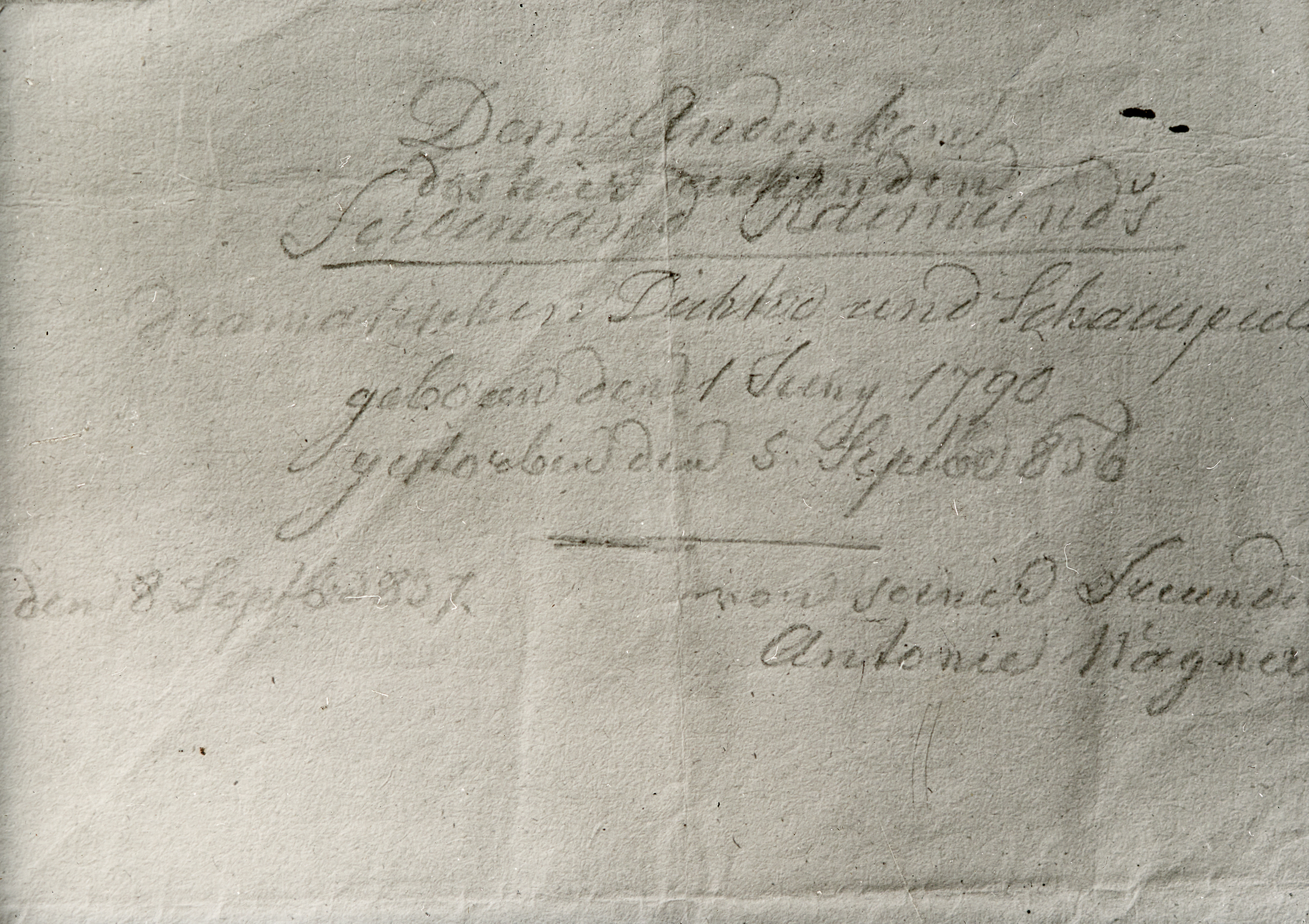 Hier ist ein handschriftlicher Entwurf von Antonie Wagner (1836-1837 ) für den Grabstein von Ferdinand Raimund zu sehen.