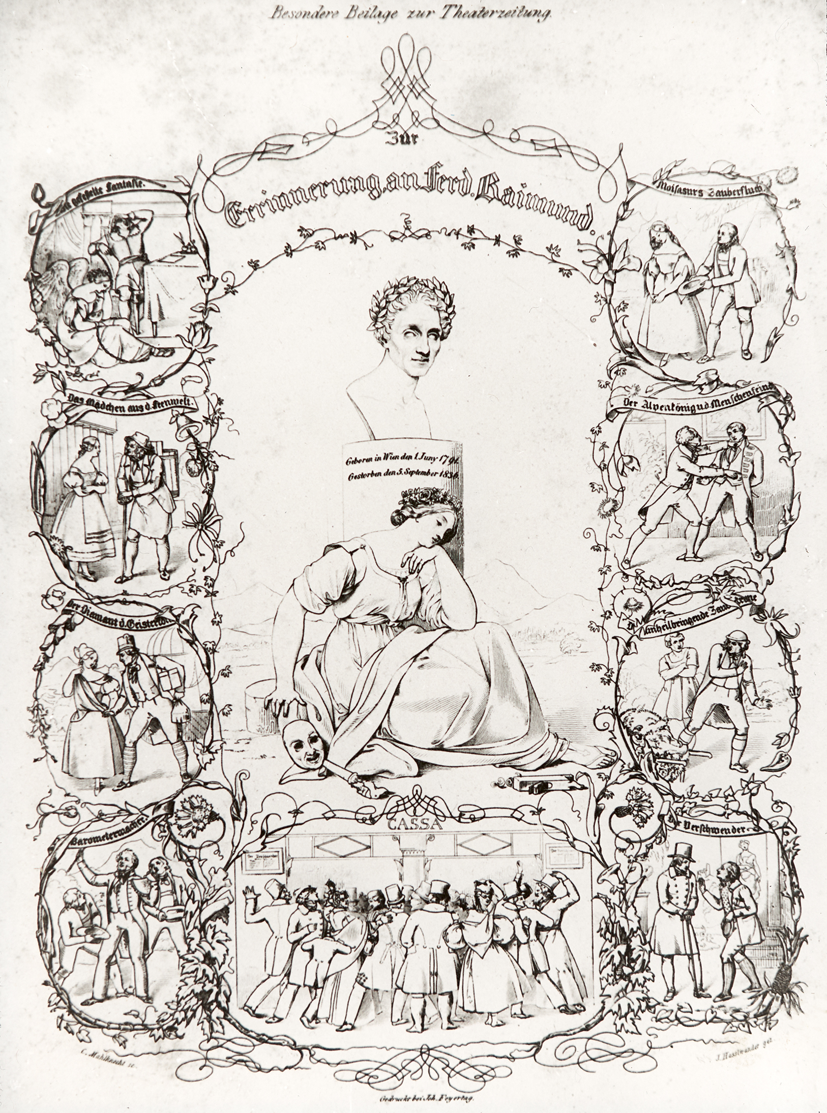 Ein Erinnerungsblatt an Ferdinand Raimund. Zu sehen ist eine Büste von Ferdinand Raimund, umrandet von verschiedenen gezeichneten szenischen Darstellungen aus Raimund-Stücken. Veröffentlicht wurde diese Zeichnung in der Wiener Theaterzeitung.