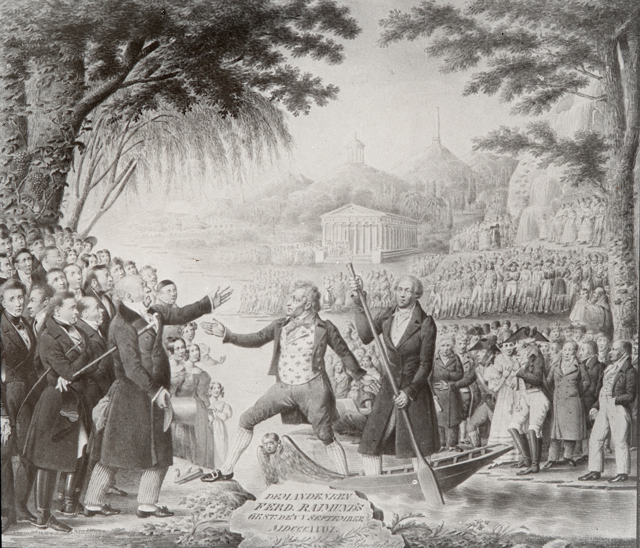 Ferdinand Raimund, dargestellt beim Übertritt ins selige Land. Beobachtet und willkommen geheißen wird er von einer großen Menschenmenge. Entstanden ist das Bild zum Gedenken an Raimund nach seinem Tod.