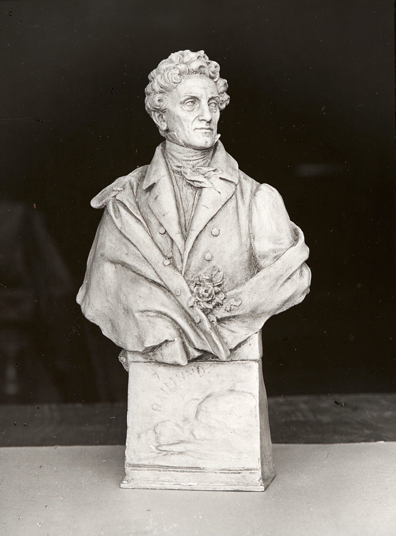 Zu sehen ist eine Büste von Ferdinand Raimund. Er trägt einen Mantel und, wie für ihn typisch, ein Band um den Hals.