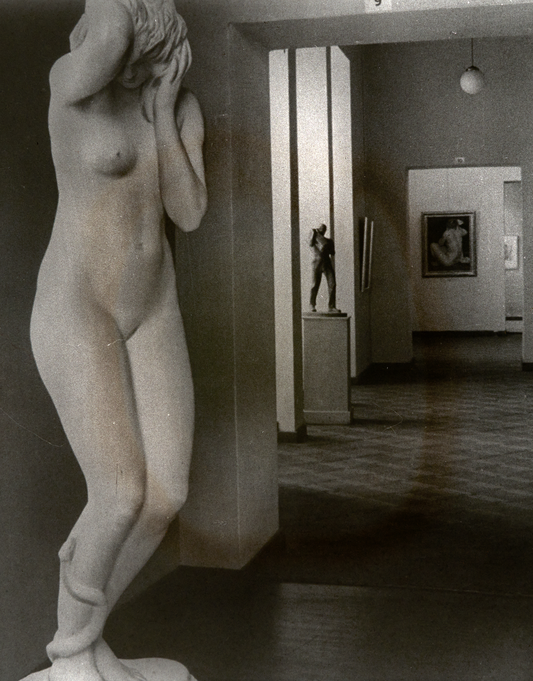 Dieses Foto zeigt einen Raum, in dem die Statue einer nackten Frau, deren Bein eine Schlange hinaufkriecht, ausgestellt ist.