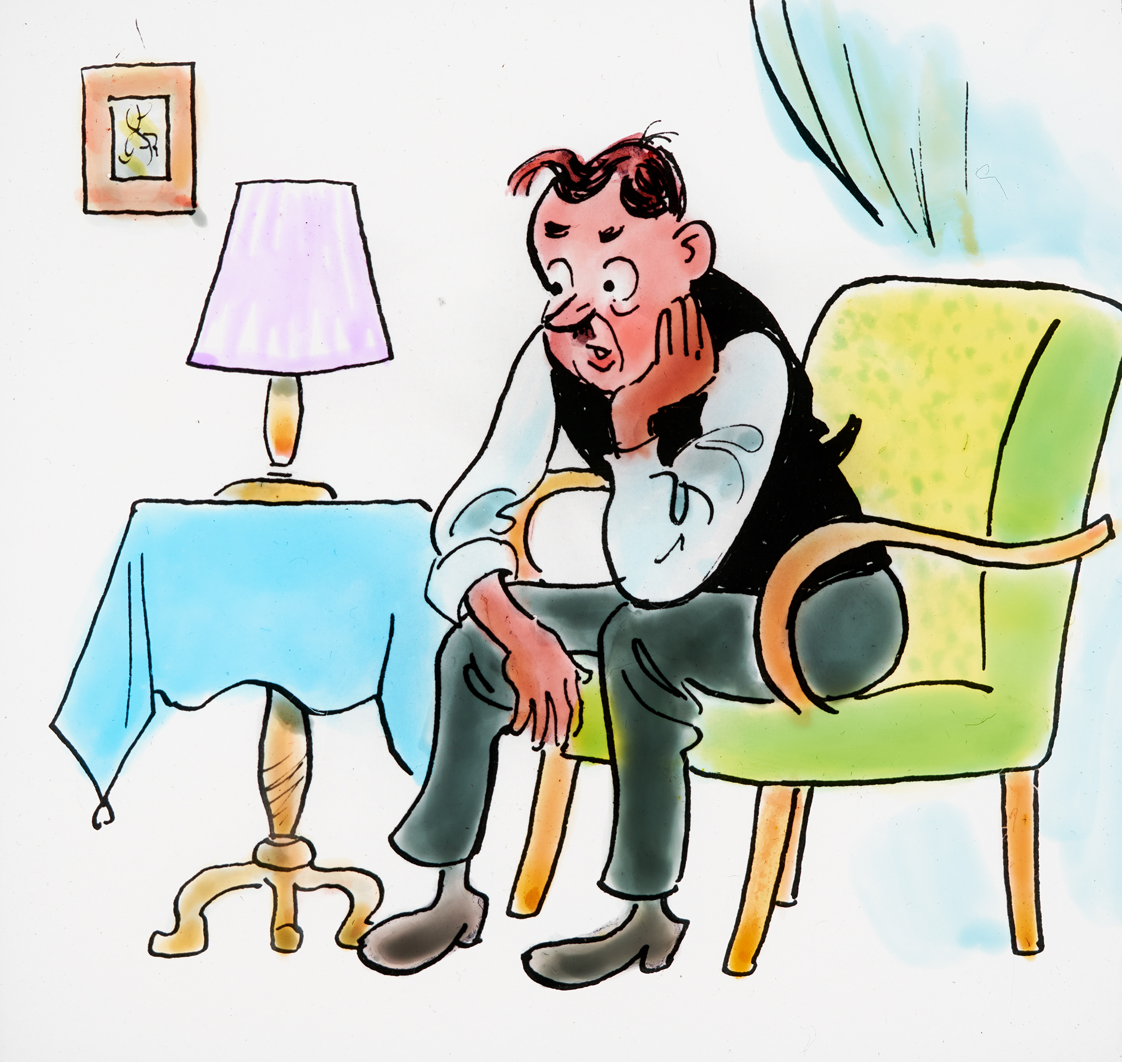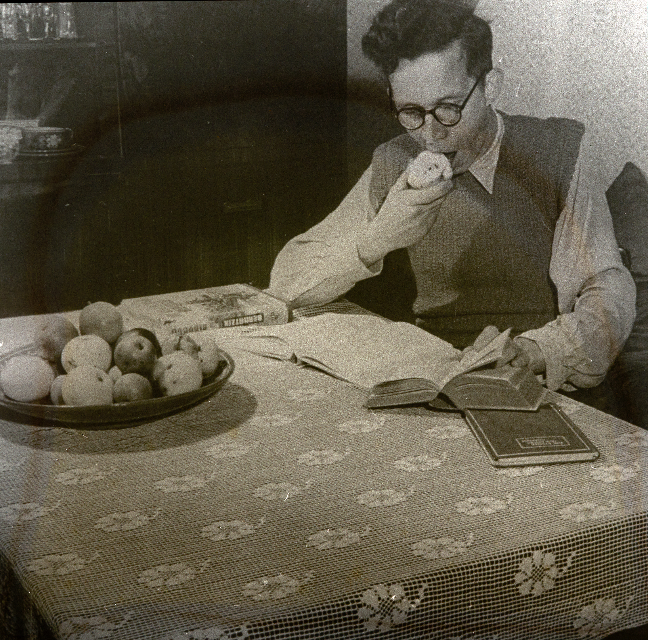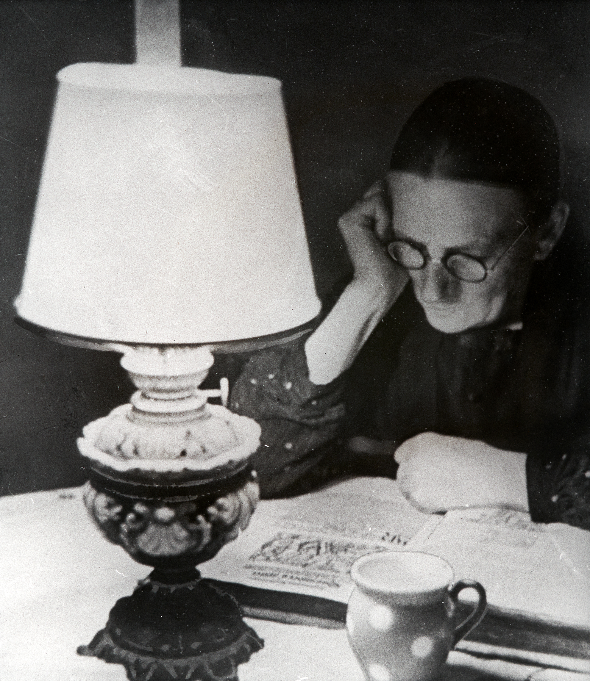 Im Licht dieser Tischlampe liest ein Mann mit Brille ein Buch.