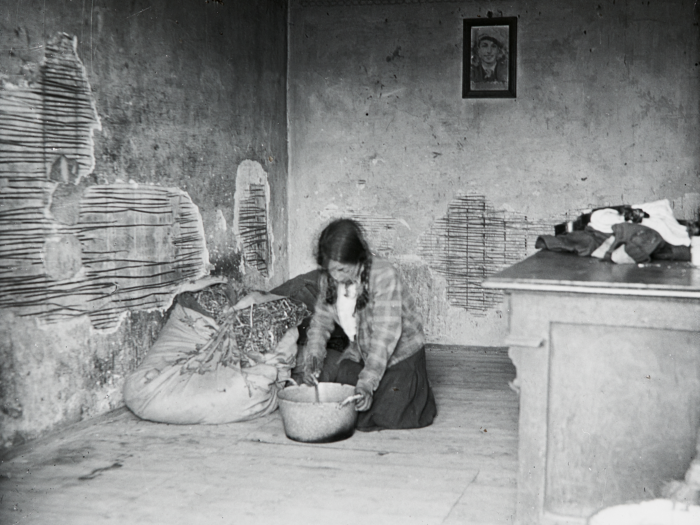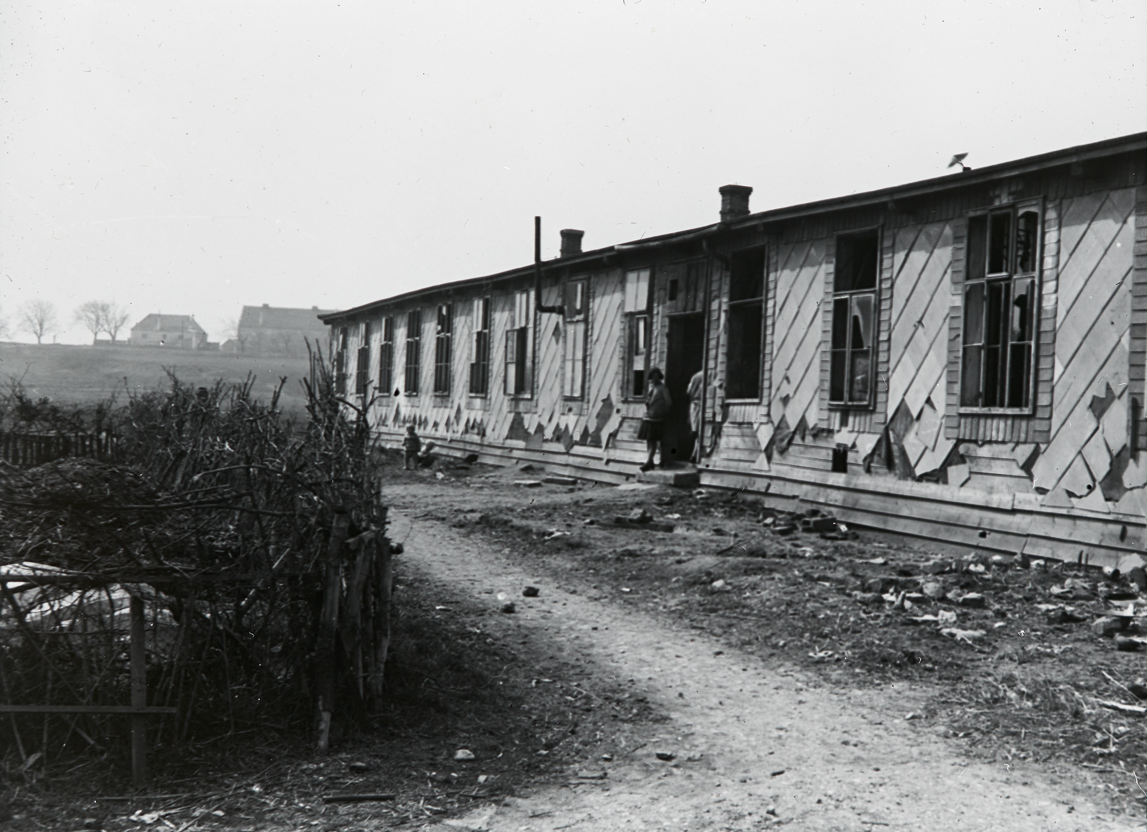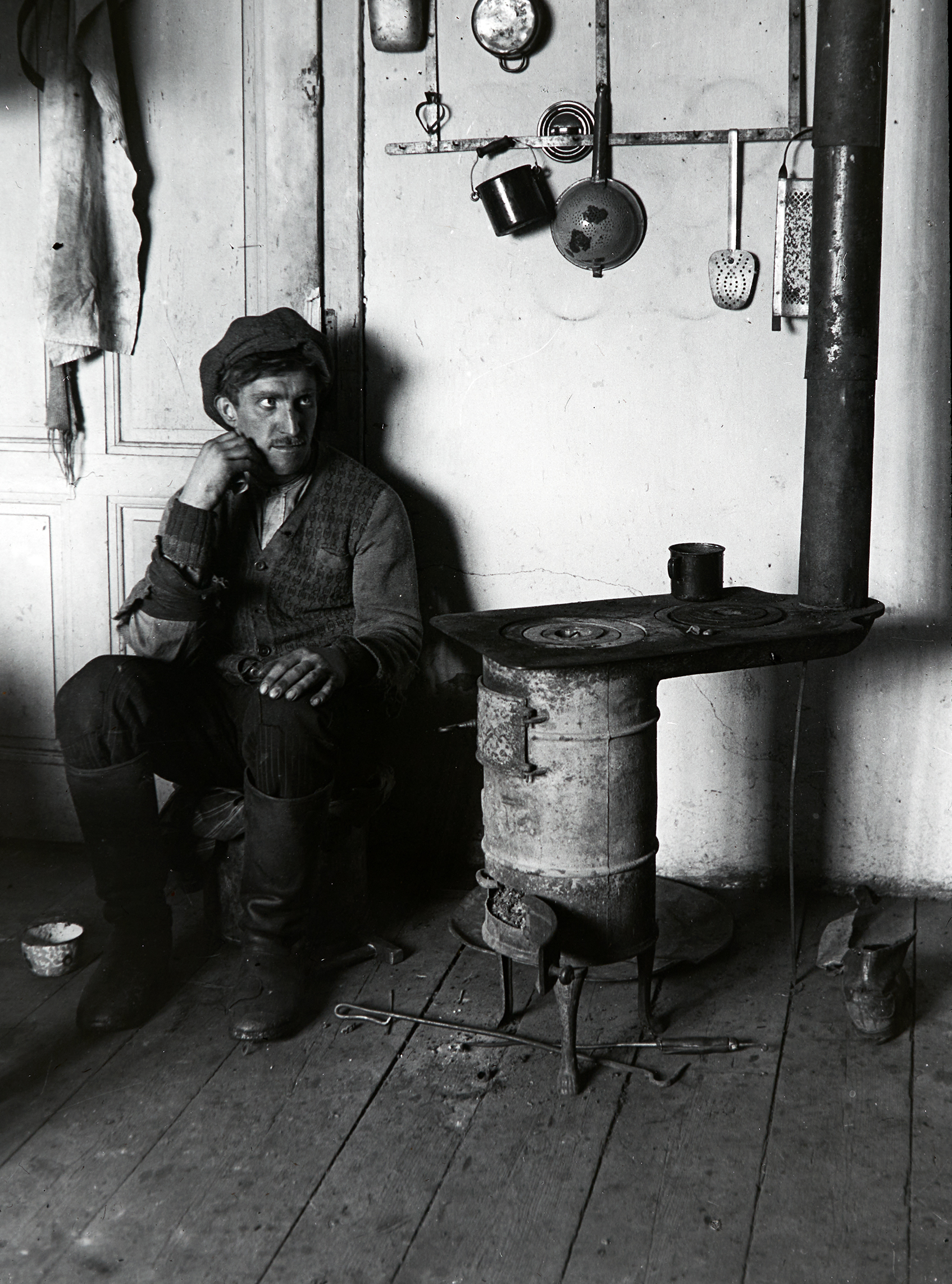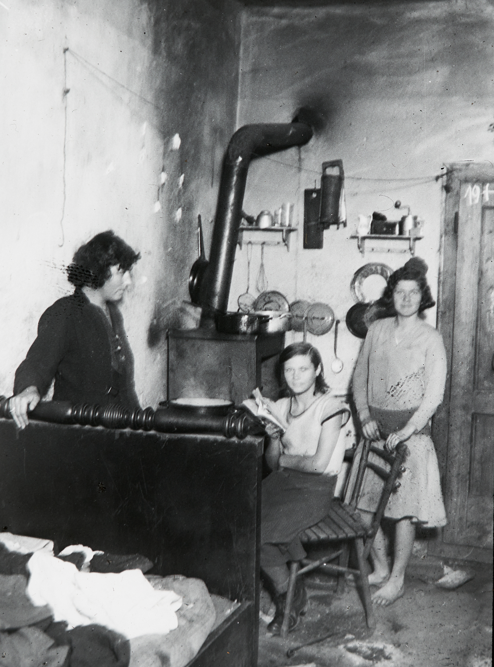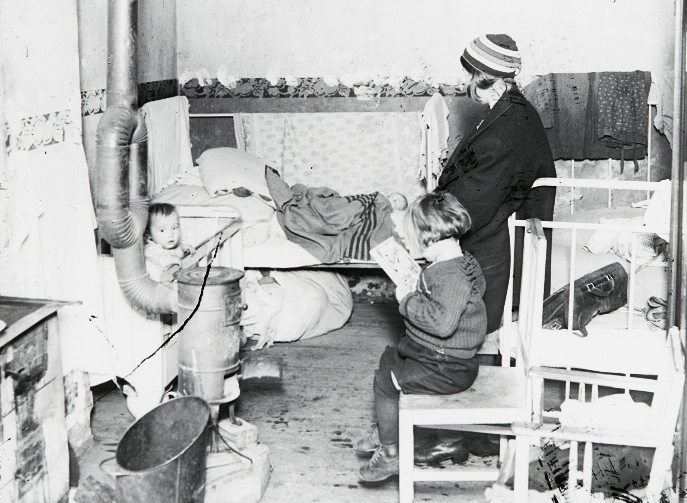 Eine Frau mit drei Kindern, inmitten des Wohn-/Schlafzimmers steht ein Ofen.