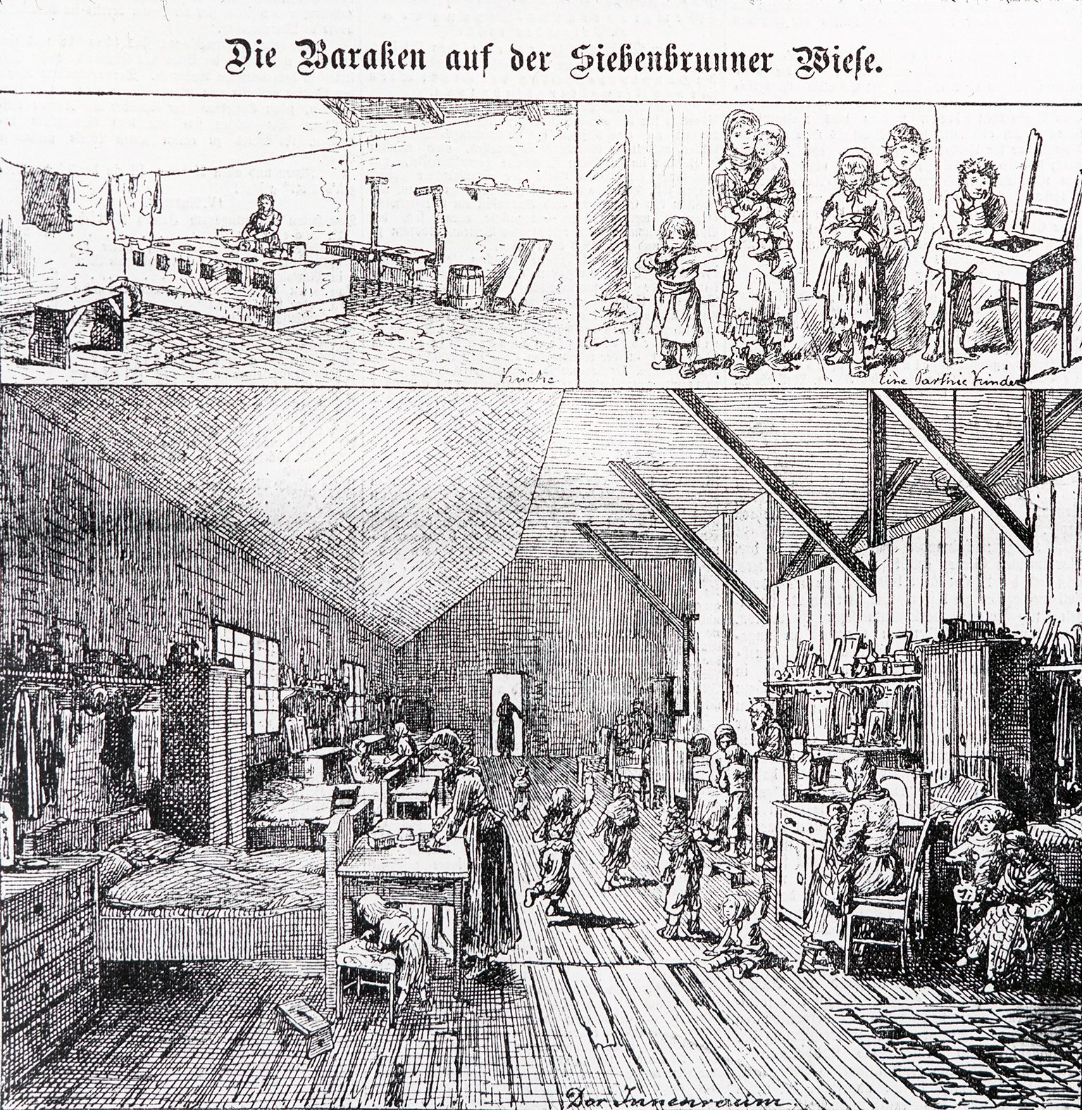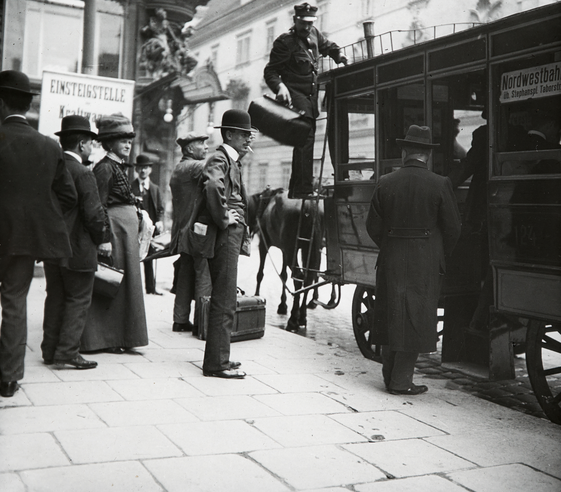 Ein Foto von Männern und Frauen, die ihr Gepäck in eine Kutsche lagern und einsteigen. Die Kutsche trägt ein Schild mit ihrer Destination, dem Nordwestbahnhof. Über den Stephansplatz und die Taborstraße gelangt sie an ihr Ziel.