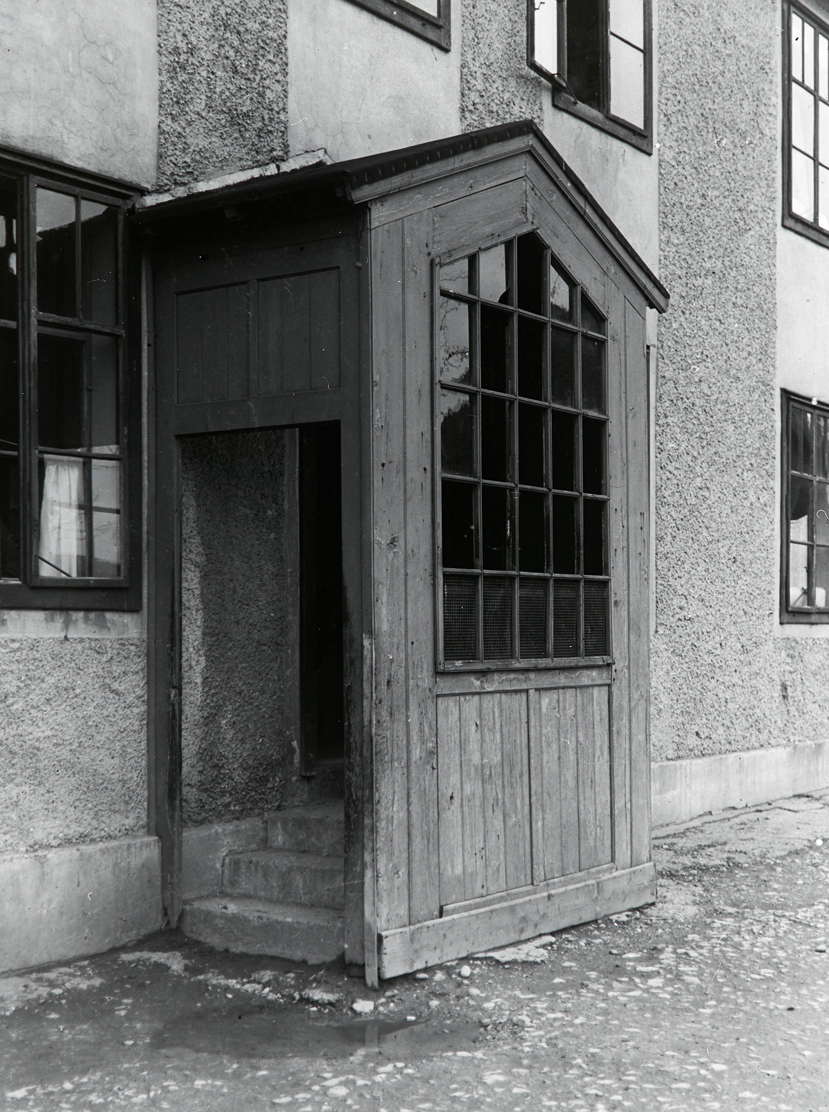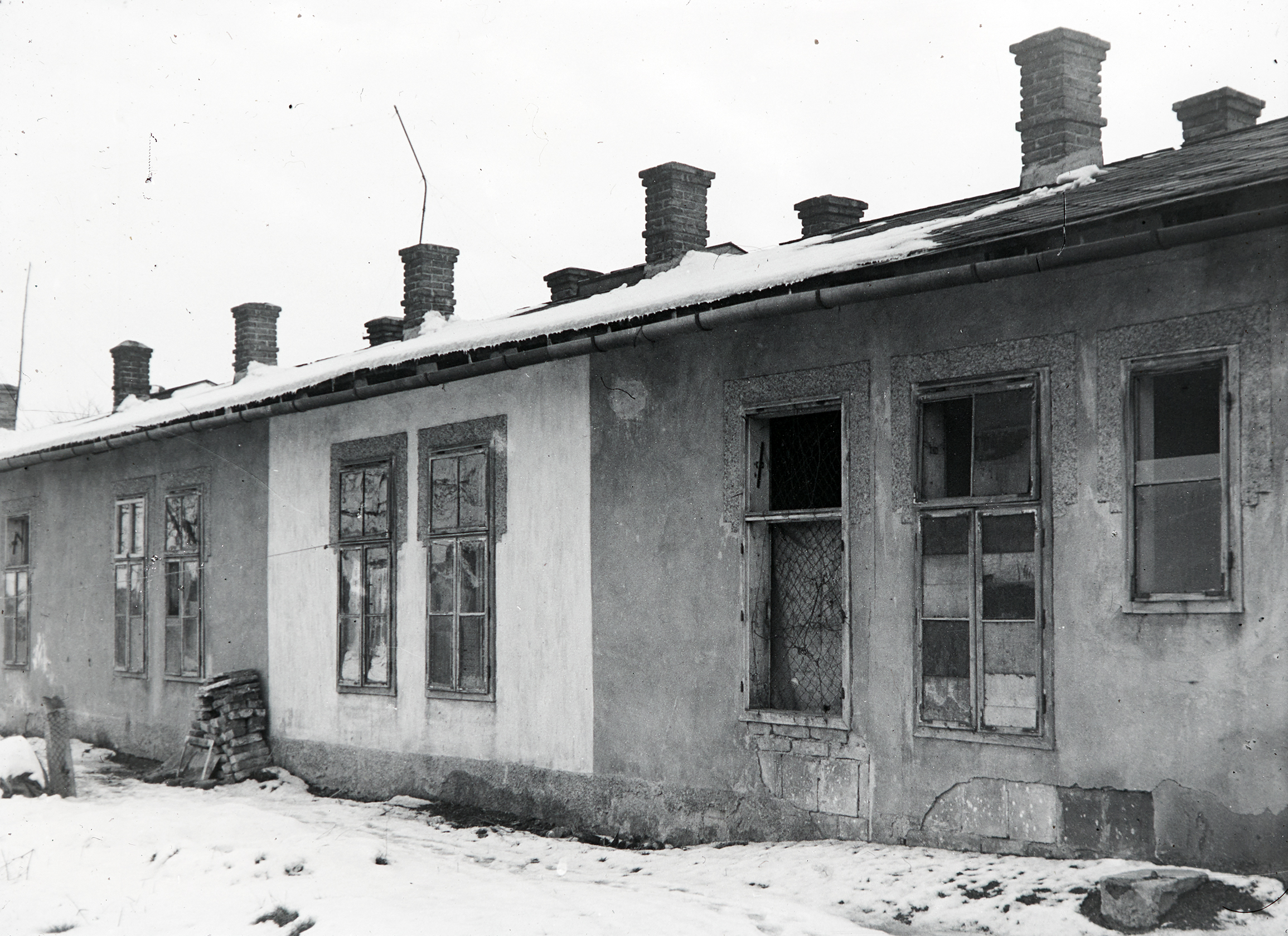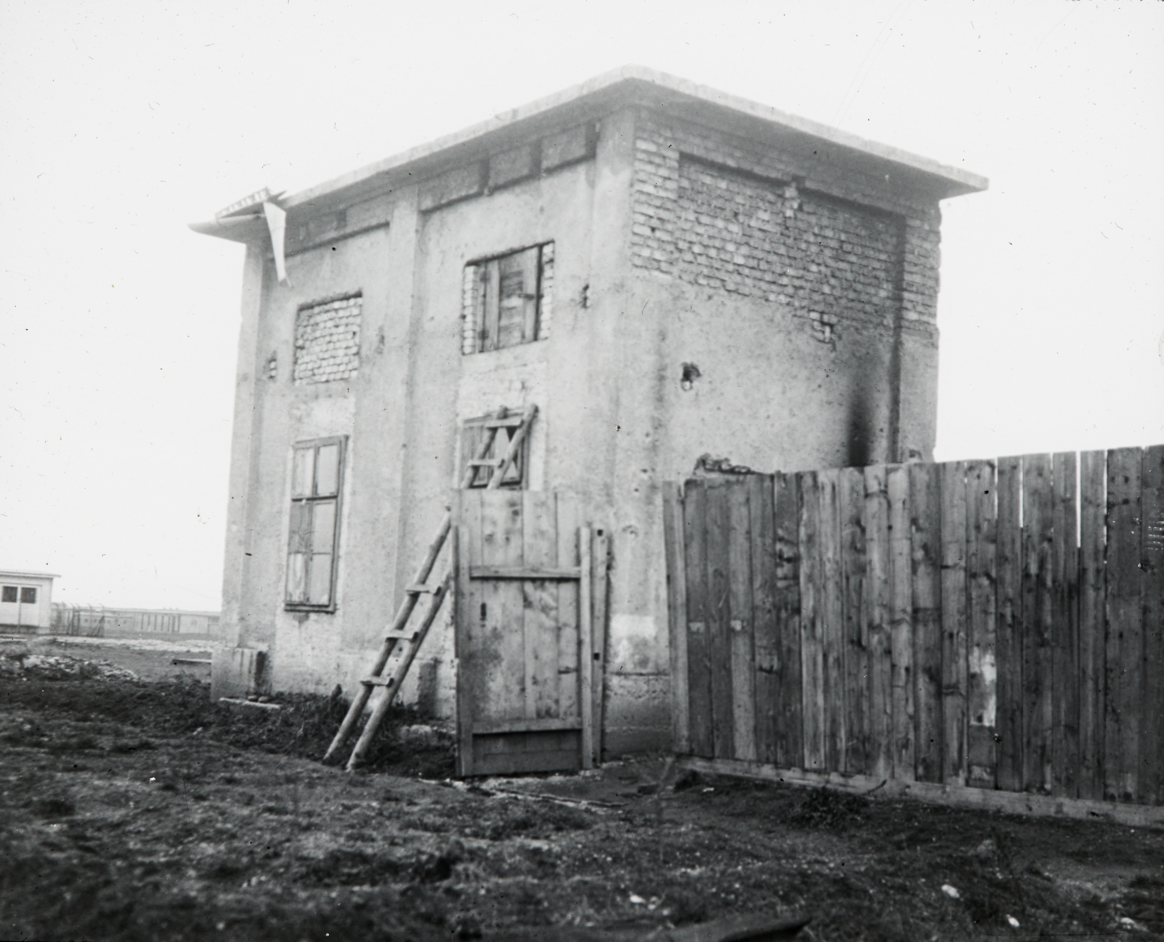 Ein Foto von einem alten Gebäude, eventuell ein Wachturm an einem Grenzzaun.
