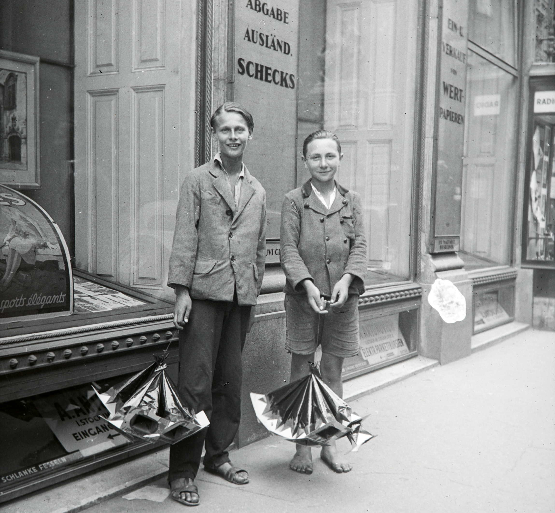 Zwei Buben vor dem Gebäude einer Geldwechselfirma. Einer der Buben ist barfuß.
