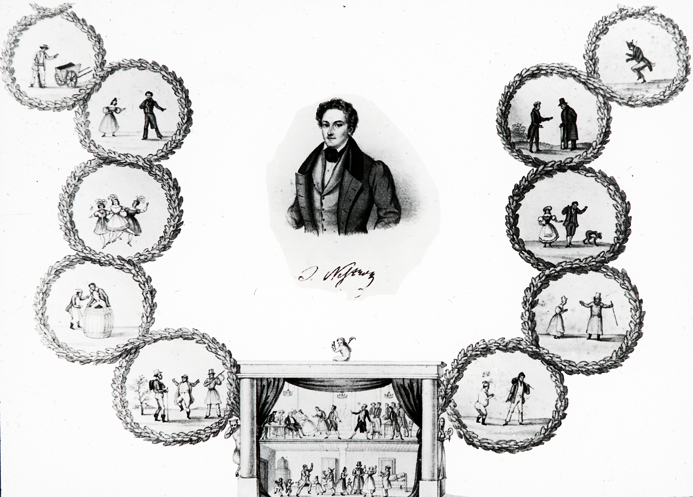 In der Mitte ein Portrait Nestroys, rund herum sind Szenen aus verschiedenen Nestroy-Werken abgebildet.