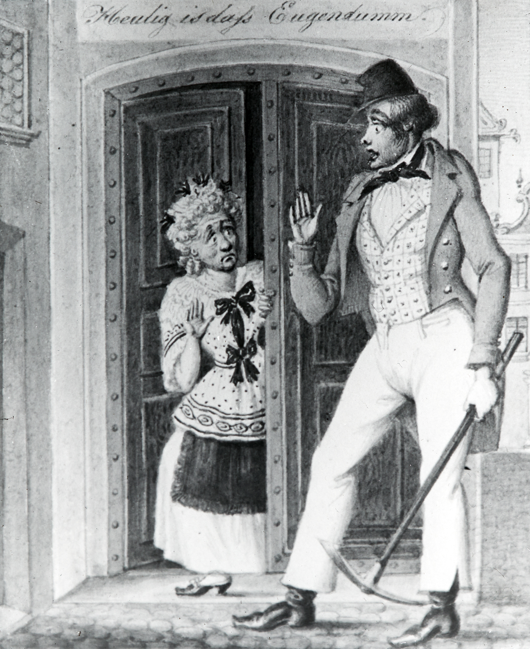 Über der Tür im Bild steht: „Heulig is daß Eigendumm.“ Dies spielt auf eine Praxis vieler BürgerInnen in der Revolution an, die aus Angst vor den Proletariern „Heilig sei das Eigentum“ auf ihre Tür schrieben.