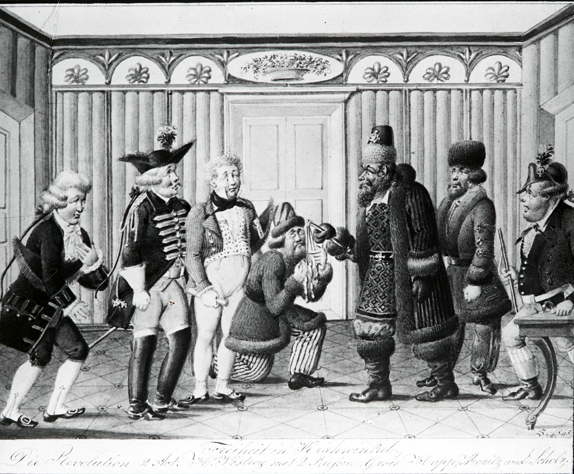 (Die Revolution, 2. Act) mit Johann Nestroy als Eberhard Ultra (in Verkleidung als russischer Fürst), Heinrich Moritz als Rummelpuff, Johann Baptist Lang als Nachtwächter und Wenzel Scholz.
