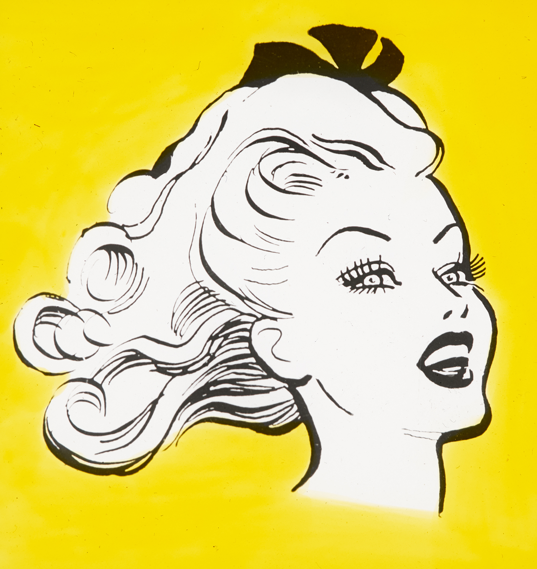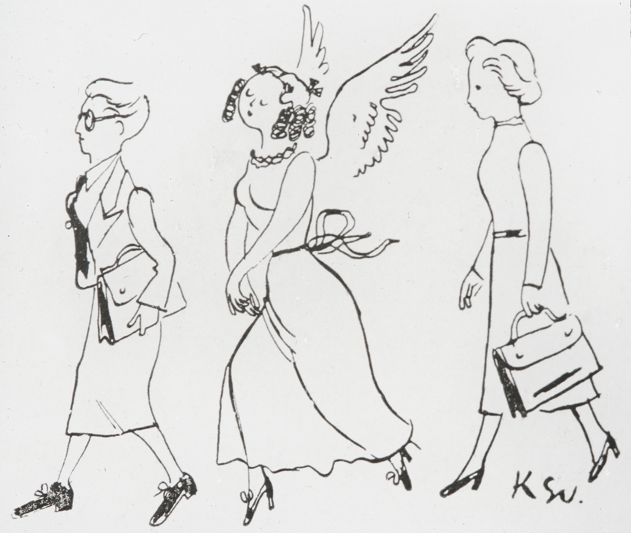 Karikatur vom Kopf einer Frau. Sie trägt eine Schleife im Haar.