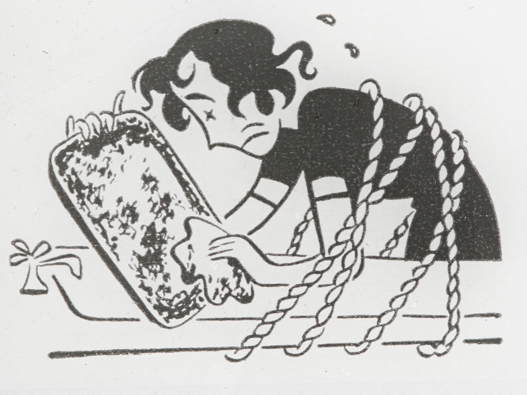 Karikatur einer Frau, die eine Auflaufform abwäscht. Sie wirkt gestresst, um ihren Oberkörper sind Fesseln gespannt.