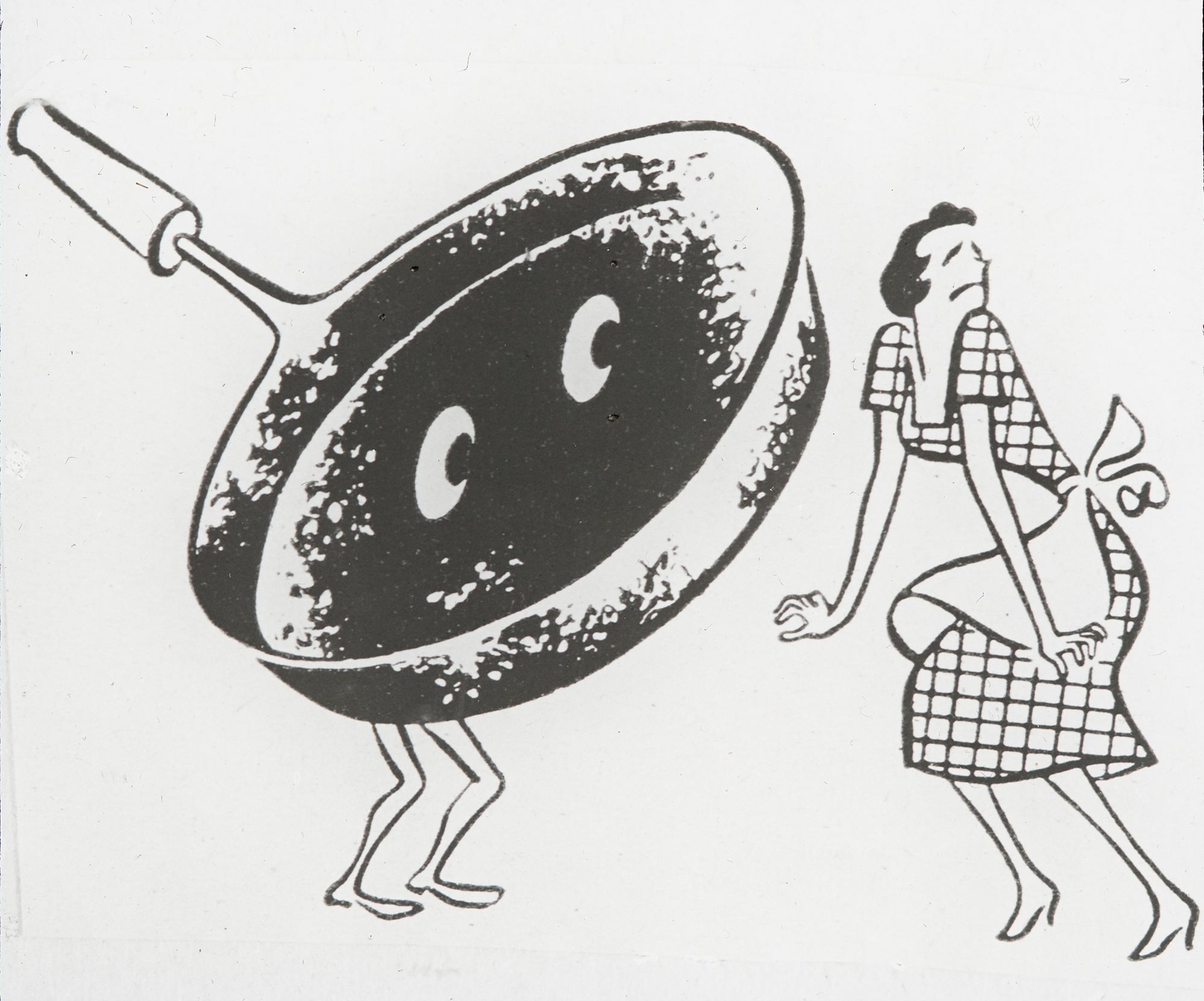 Karikatur einer Pfanne mit Augen und Beinen, daneben steht eine Frau in kariertem Kleid mit Schürze.