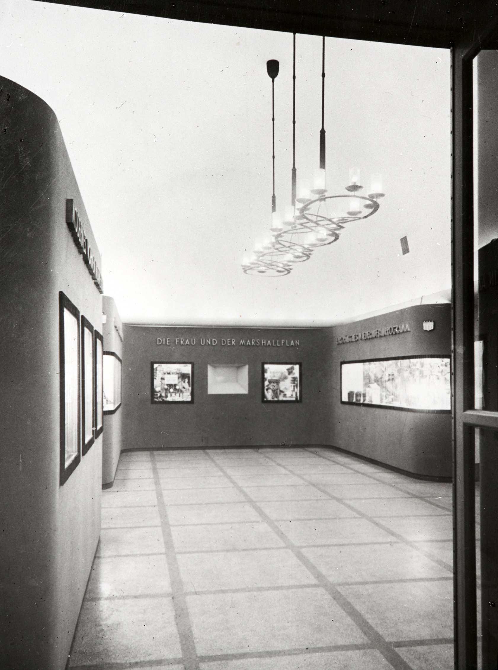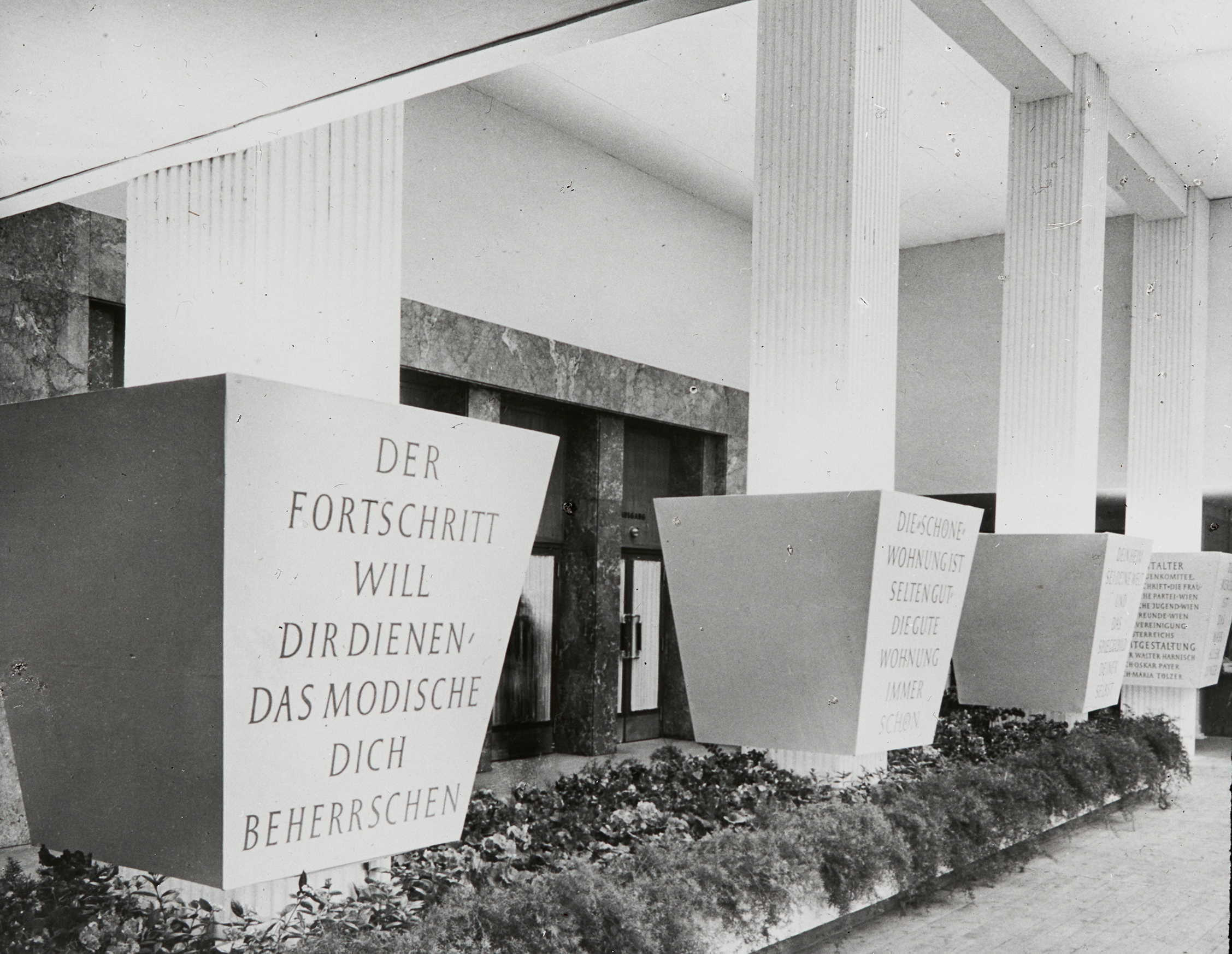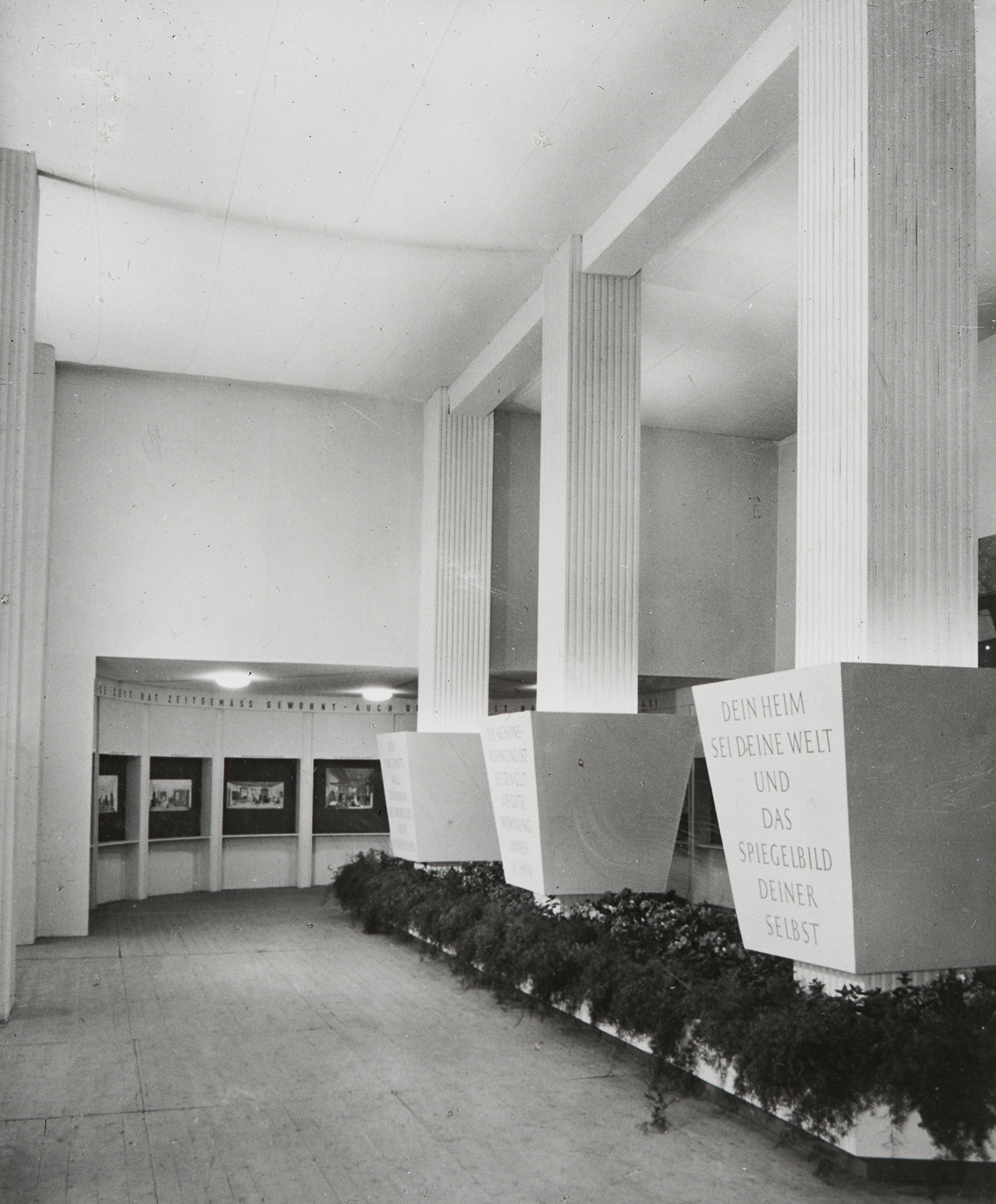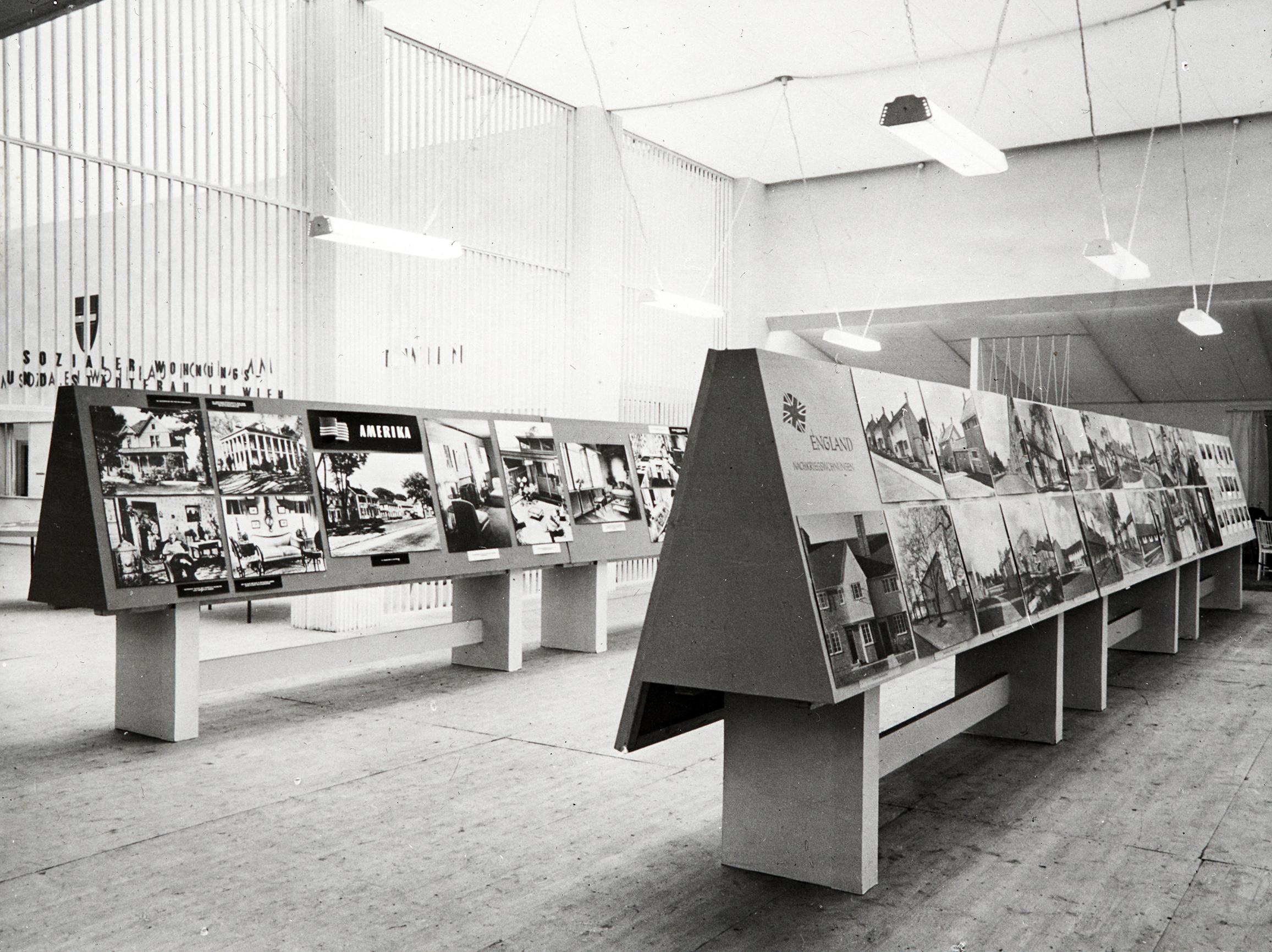 Ein Foto der Ausstellung "Die Frau und ihre Wohnung" im Messepalast. Hier wird internationale Architektur, etwa aus Amerika oder England, ausgestellt.