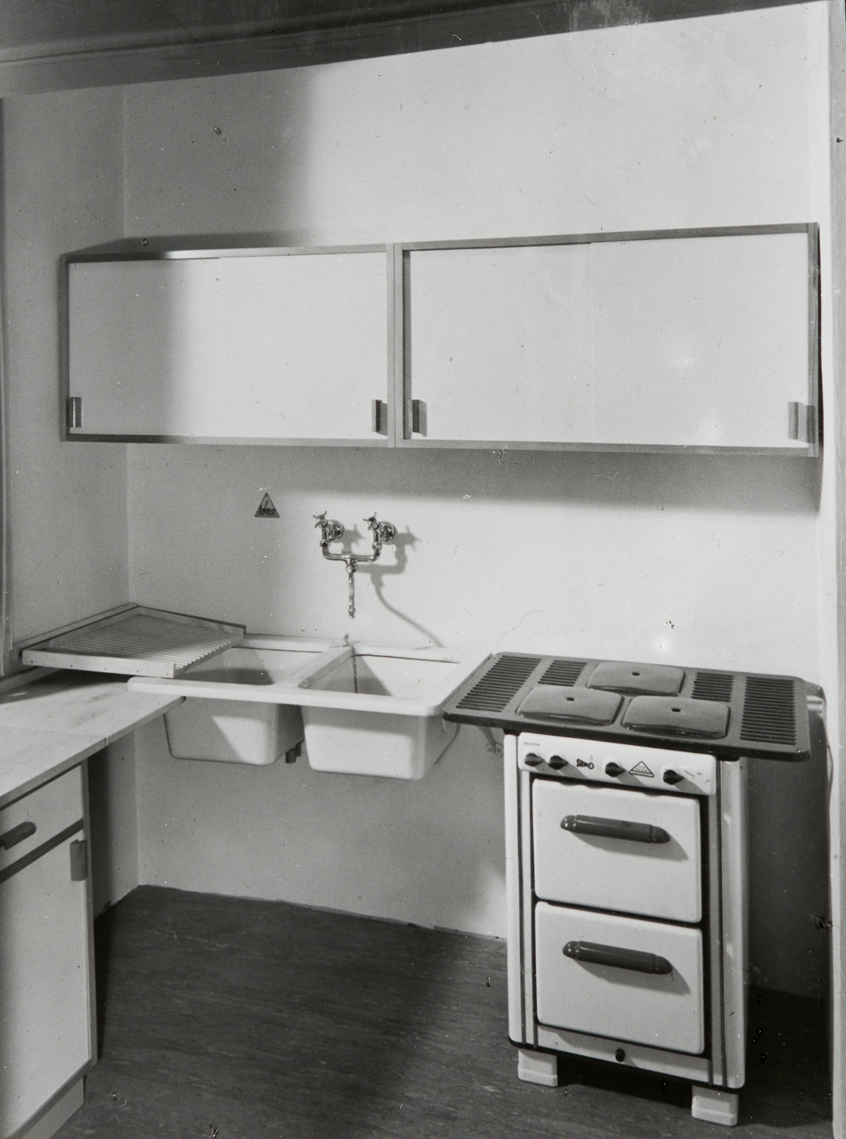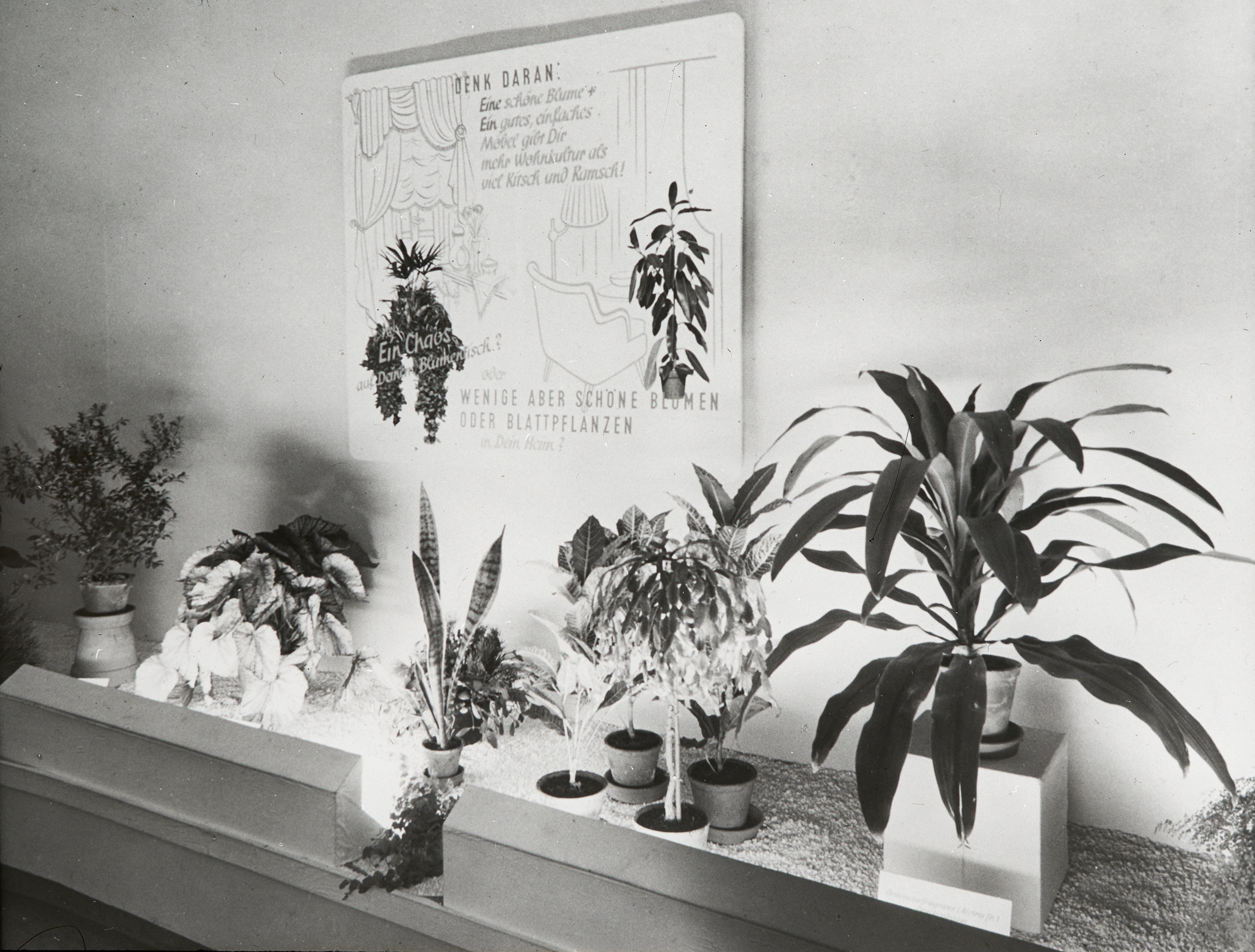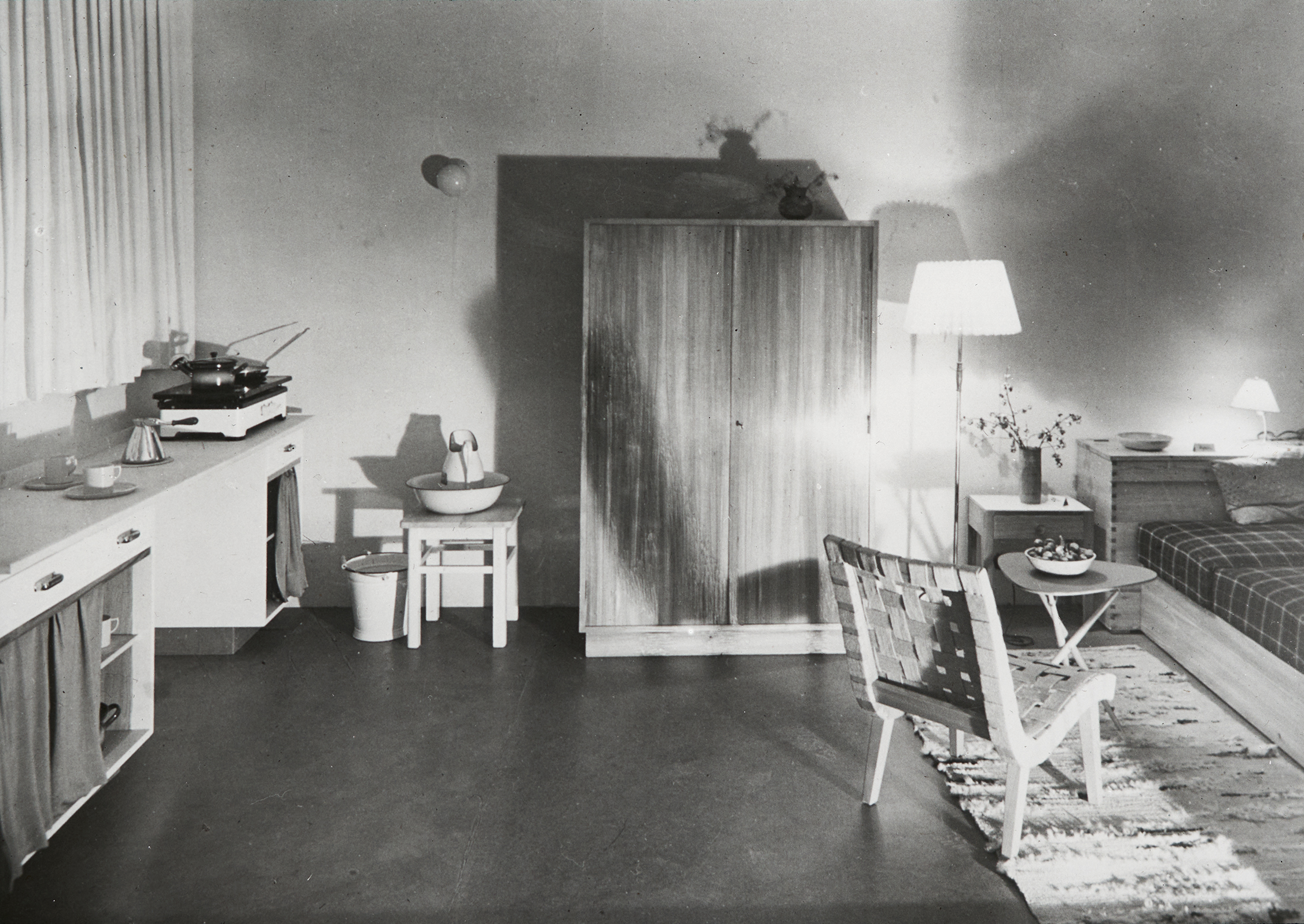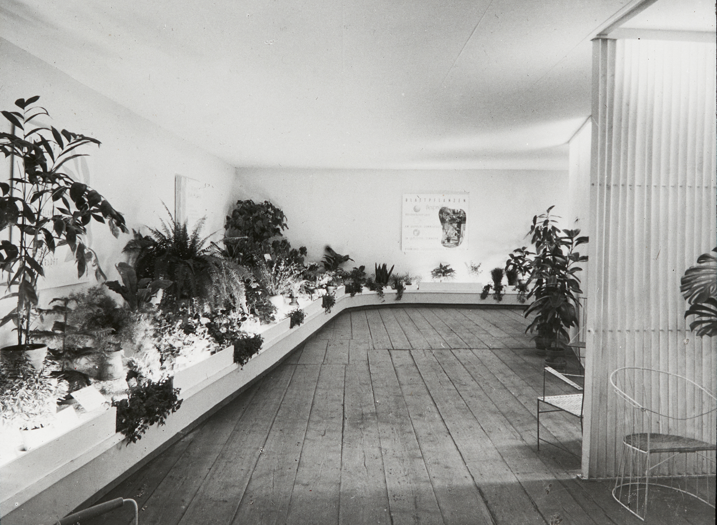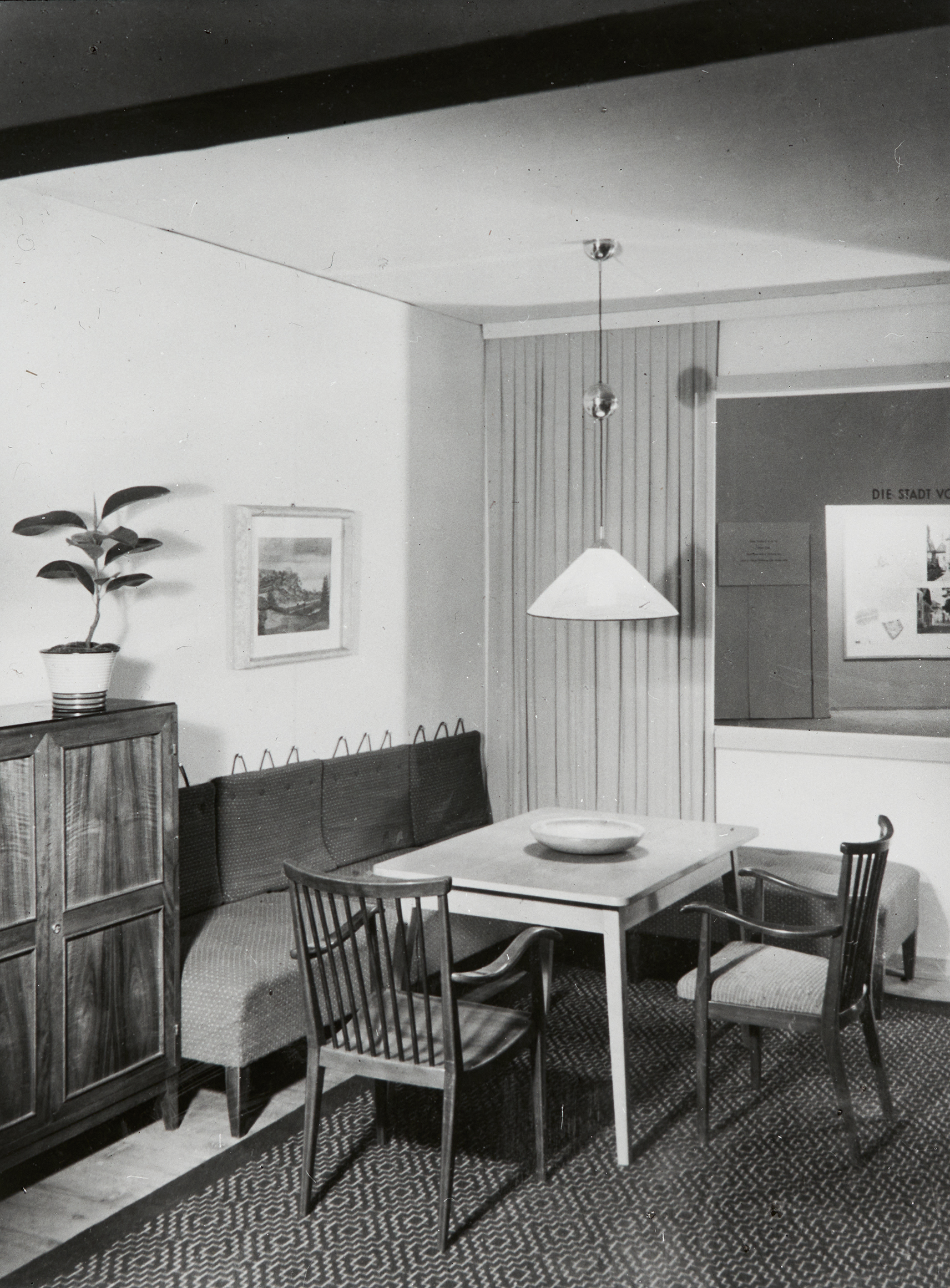 Ein Foto der Ausstellung "Die Frau und ihre Wohnung" im Messepalast. Hier wird internationale Architektur, etwa aus Amerika oder England, ausgestellt.