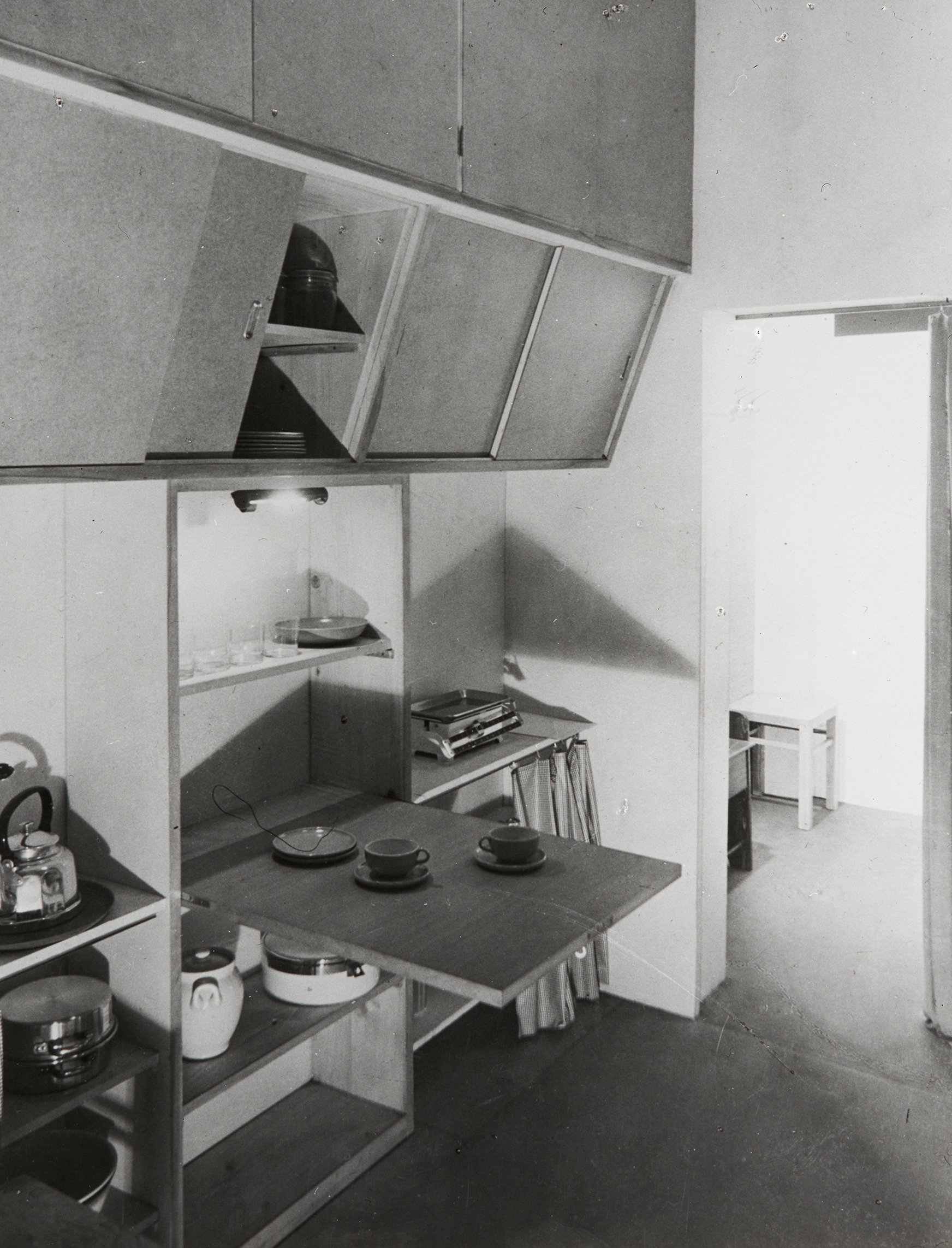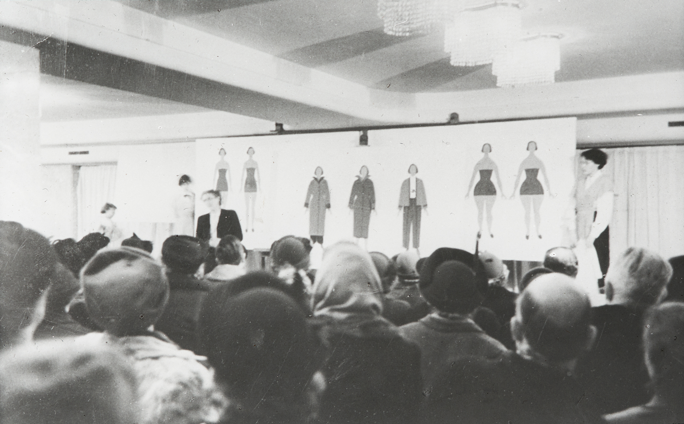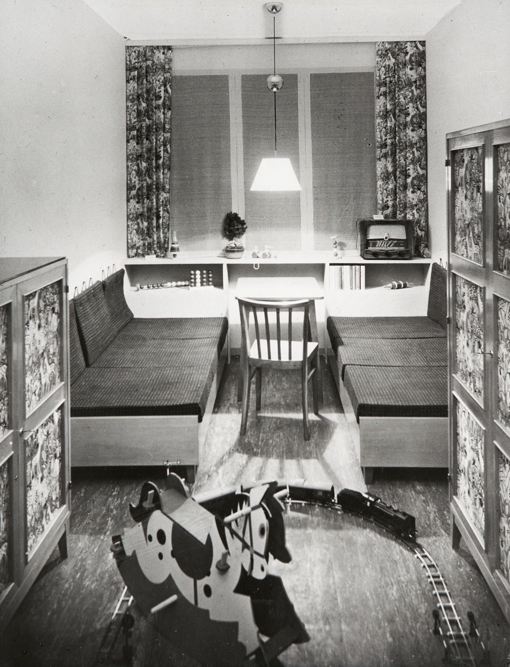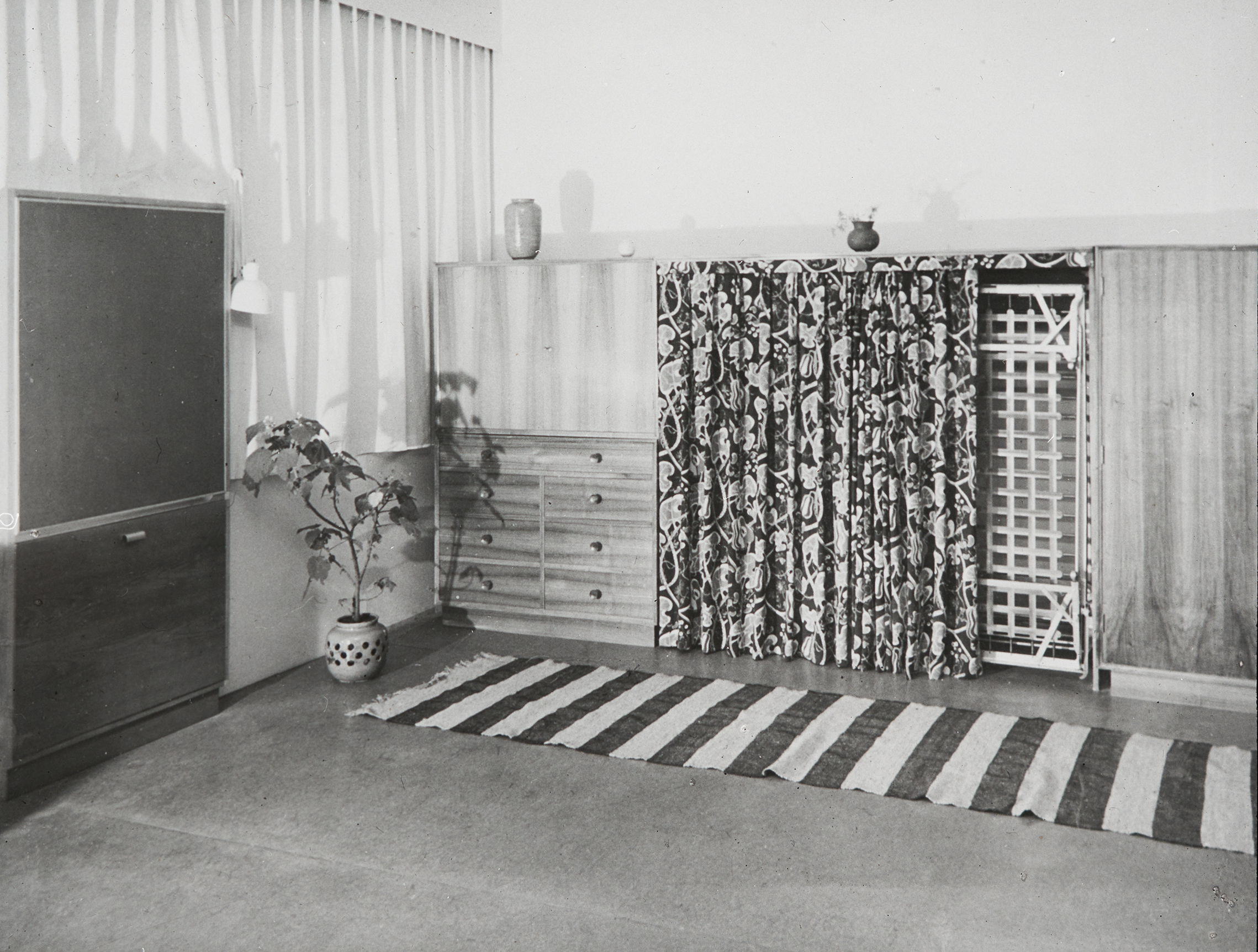 Ein Foto der Ausstellung "Die Frau und ihre Wohnung" im Messepalast. Hier wird internationale Architektur, etwa aus Amerika oder England, ausgestellt.