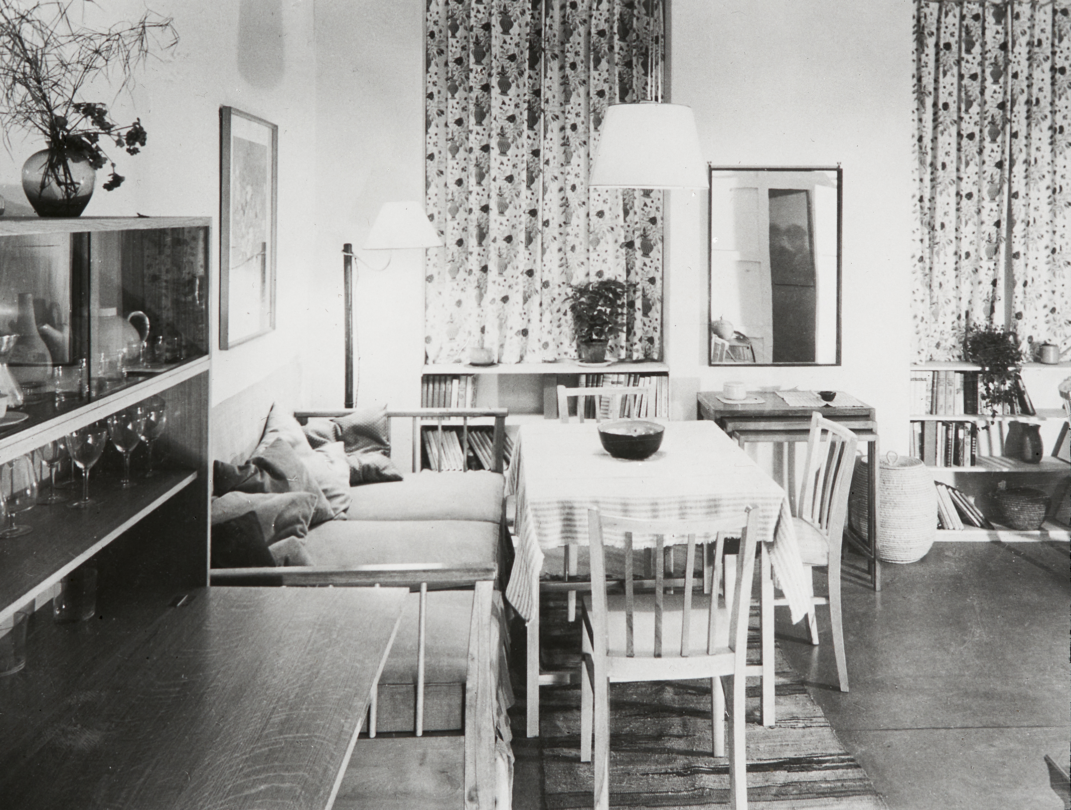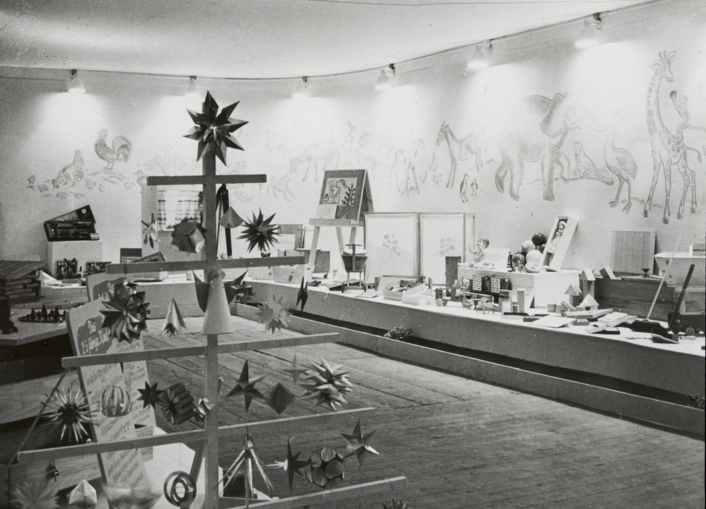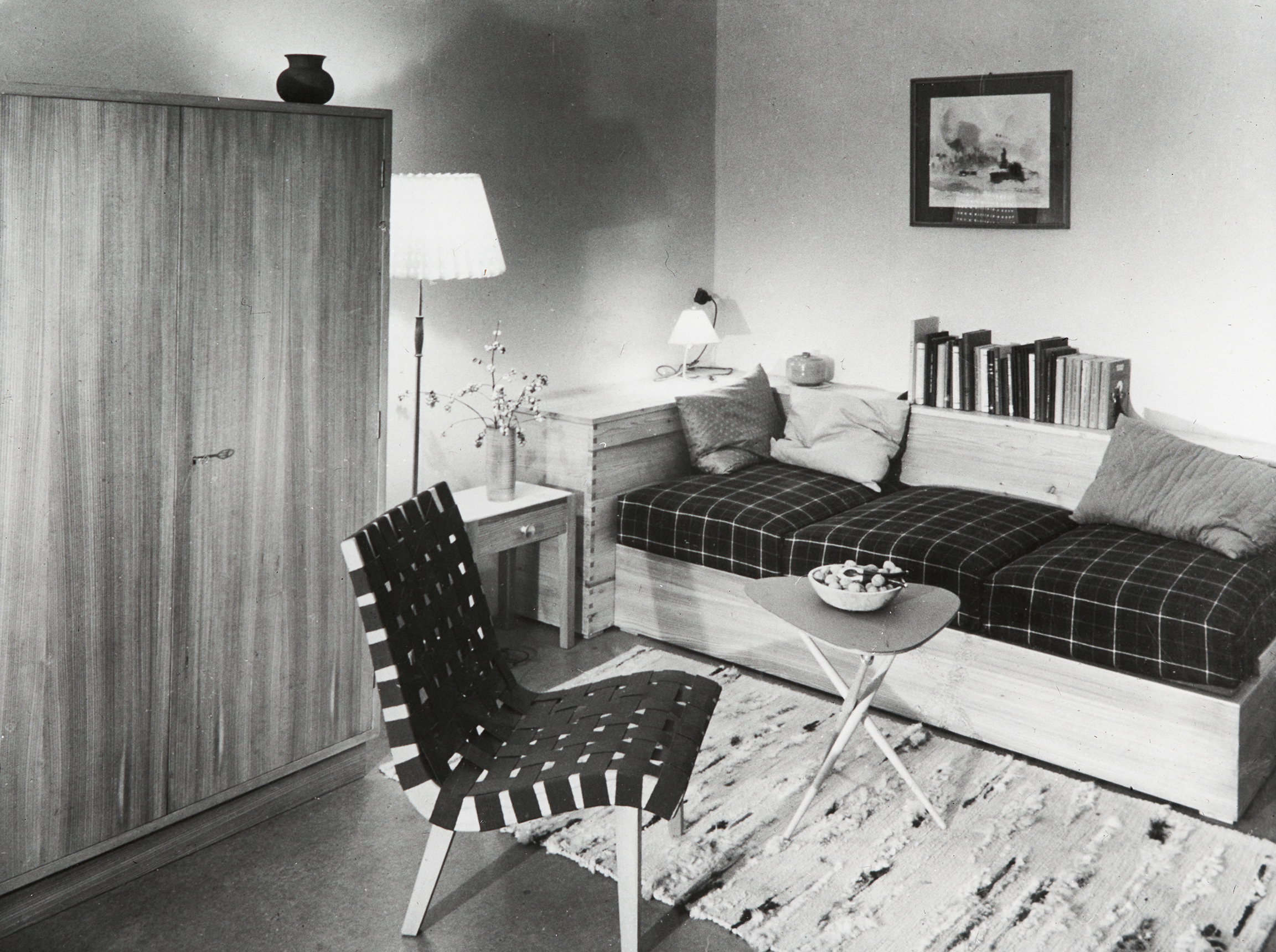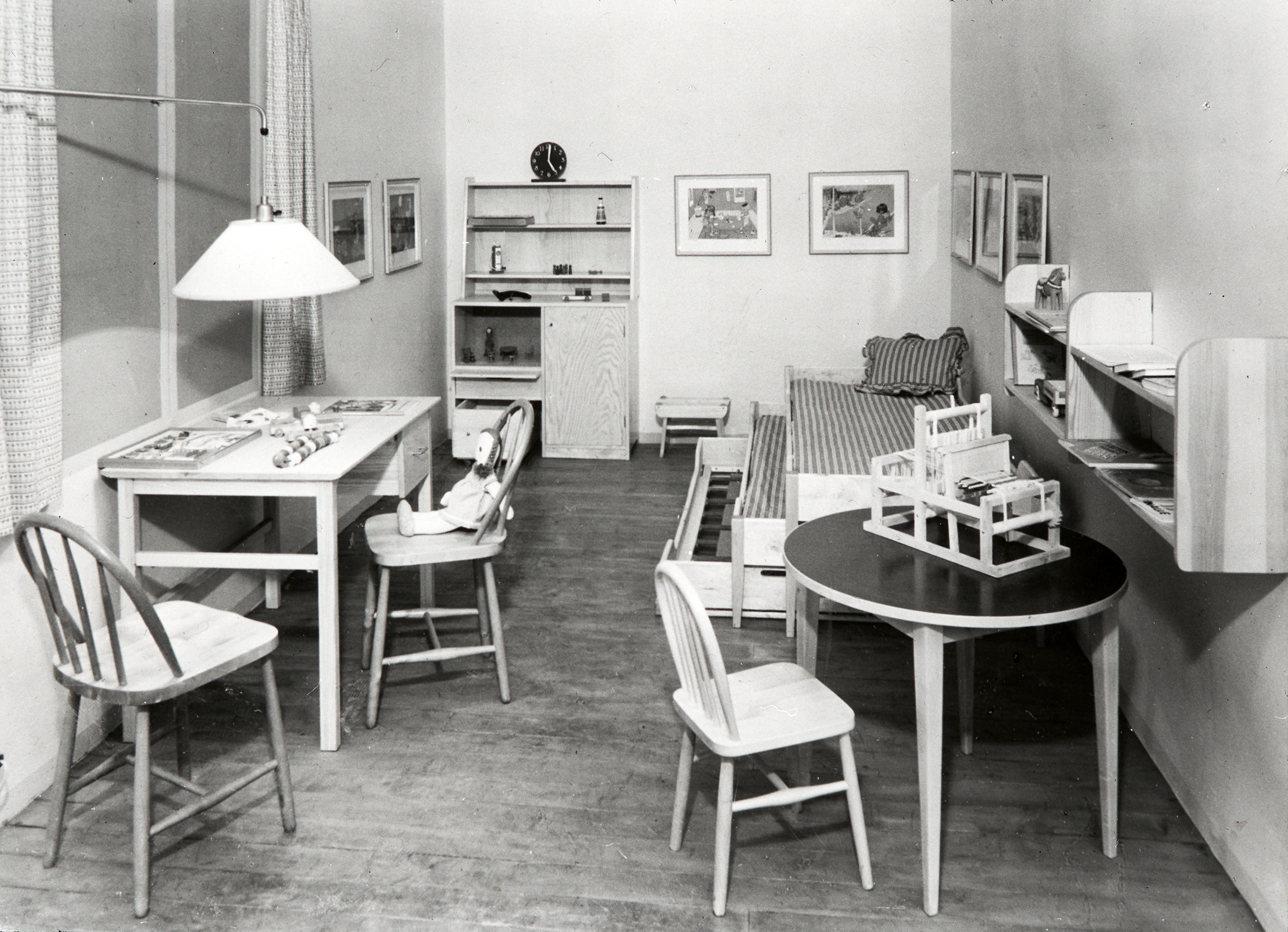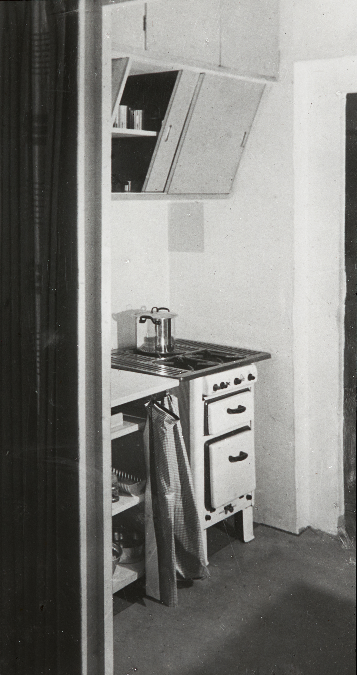 Ein Foto der Ausstellung "Die Frau und ihre Wohnung" im Messepalast. Hier wird internationale Architektur, etwa aus Amerika oder England, ausgestellt.