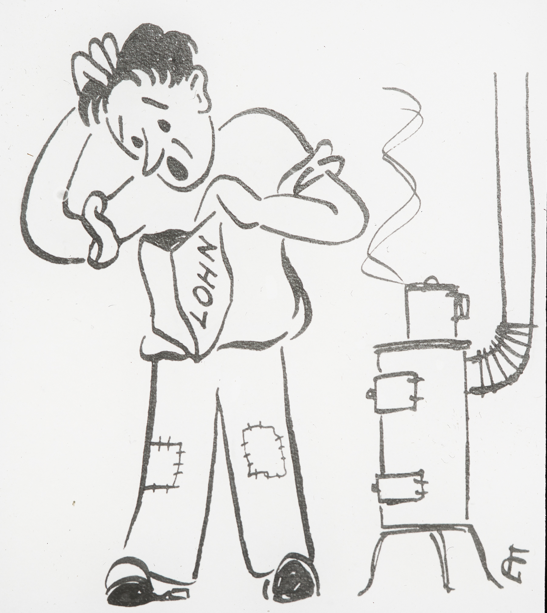 Karikatur eines Mannes, der entsetzt seinen Lohnzettel anschaut