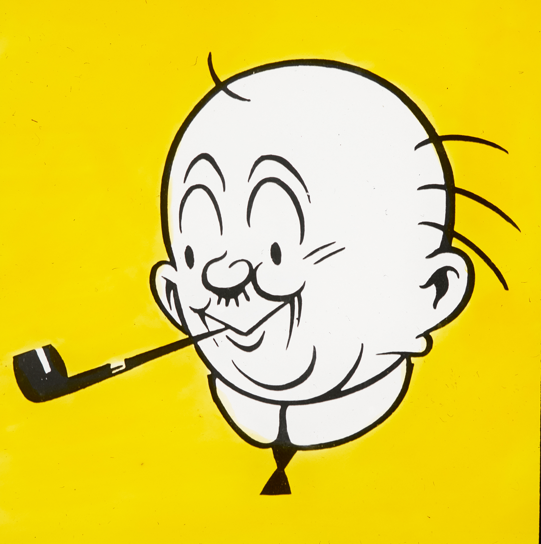 Karikatur eines Mannes mit Pfeife im Mund, er trägt eine Glatze und eine Krawatte um den Hals.